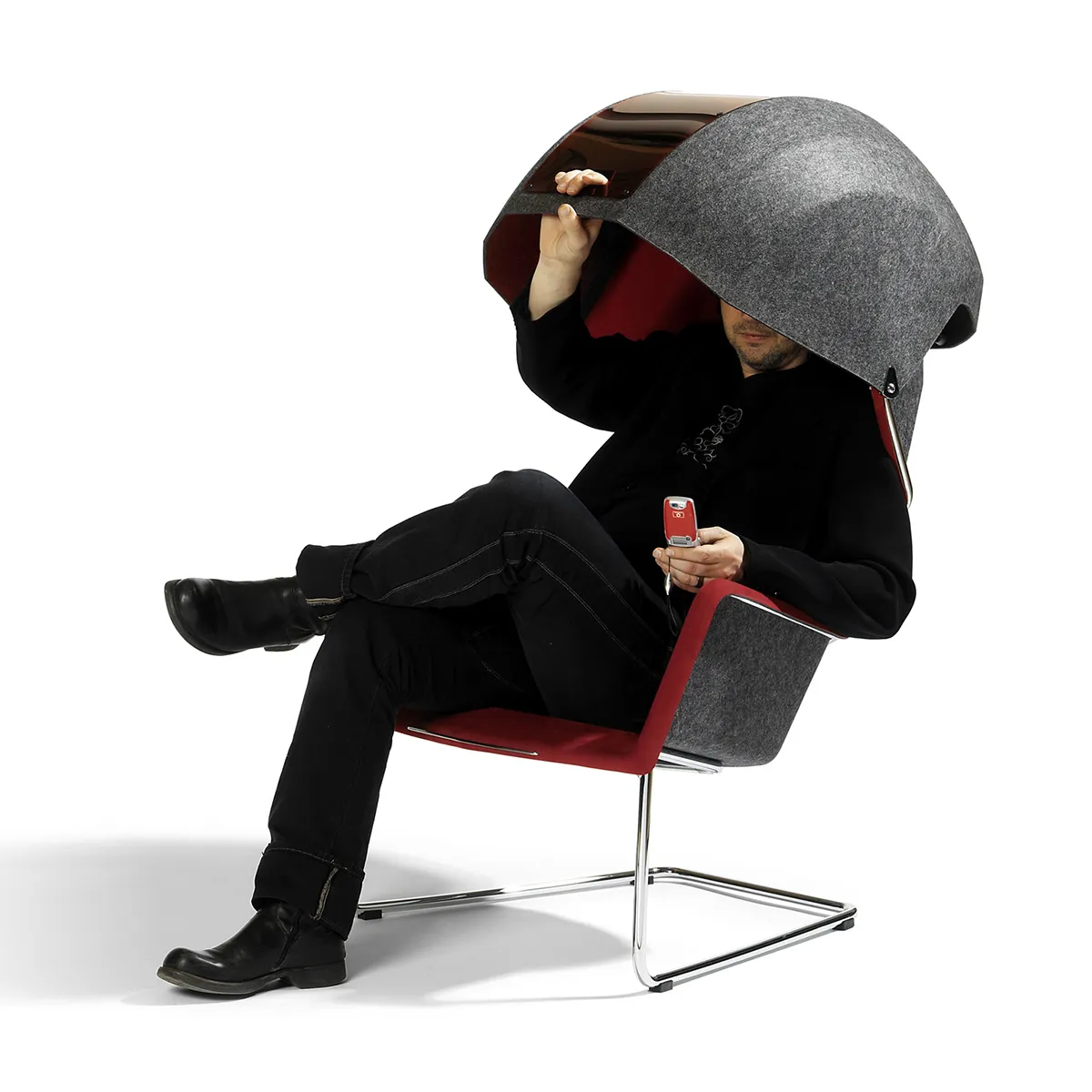 In times when we are breaking down existing barriers to facilitate meetings and shared encounters, new needs soon arise for seclusion. The Peekaboo wing-chair that was shown for the first time last Stockholm Furniture Fair 2005, a modern wing-chair with a possibility to add a hood in formfelt (the material is in itself sound absorbing) to create a small oases, a small room of your own. Peekaboo is now presented with new clothes ready for delivery. The moulded formfelt can be in Grey, Black or White and has been laminated with Alcantara on the inside to give a surface that is soft, comfortable and has a strong hold. For the first time ever possible on a product were the challenge to succeed in pressing the material to it’s outer limits was already in itself an impossibility that became possible.