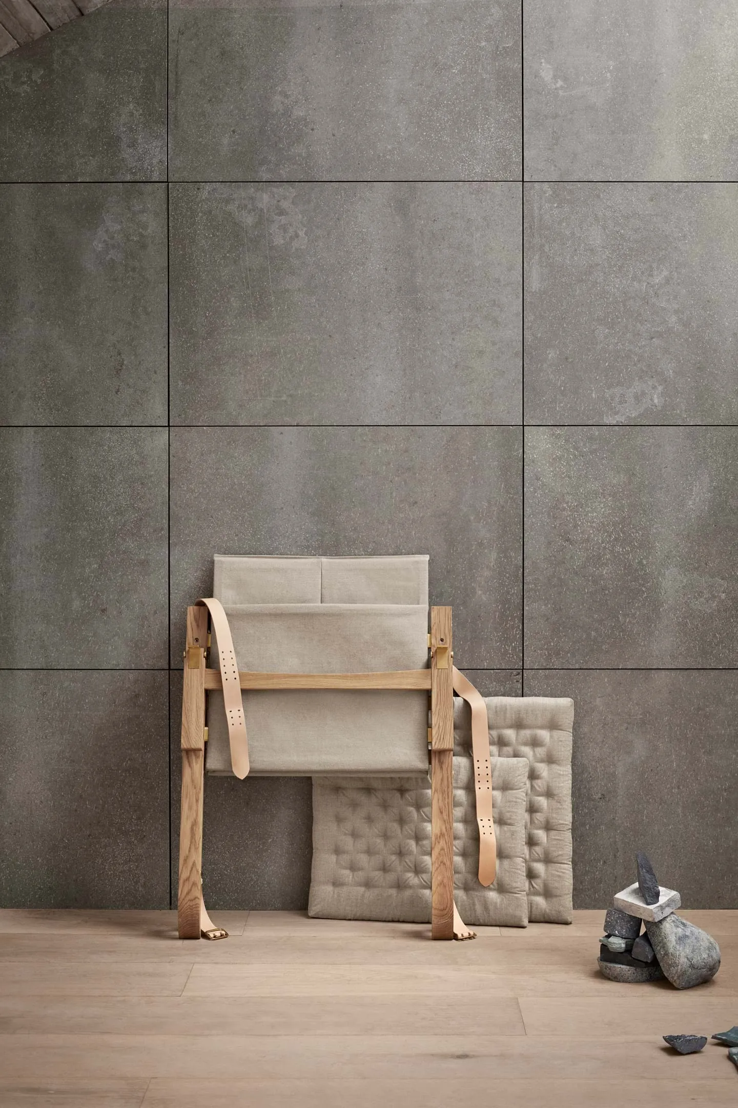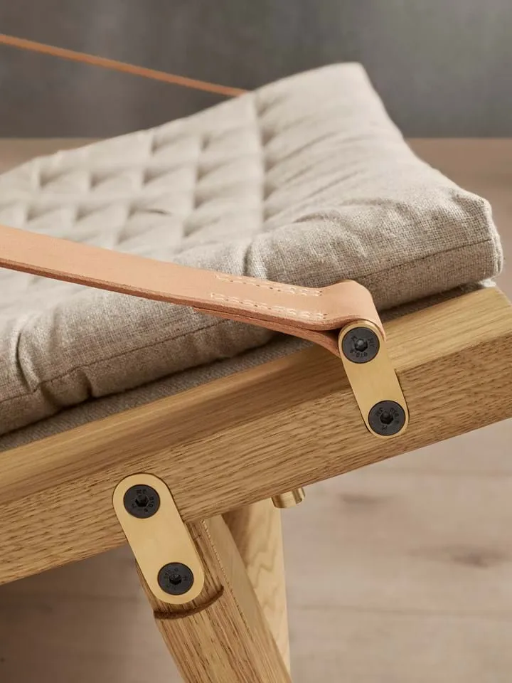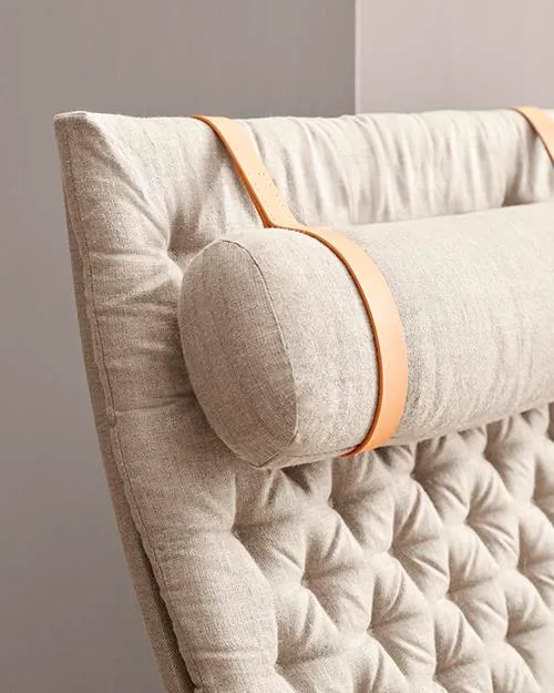 Taking its name from the Latin word ‘to fold,’ the versatile design appears simple at first glance. Closer examination reveals an extremely detailed design: the solid oak frame is shaped for stability. Saddle leather armrests attached to the curved rear legs results in a characteristic expression. Visible brass fittings add a sense of character, and the stitched linen canvas back, seat rest and cushions give the chair an added degree of comfort. Available in low and high back versions, the latter has a leather-trimmed neck cushion for extra support.