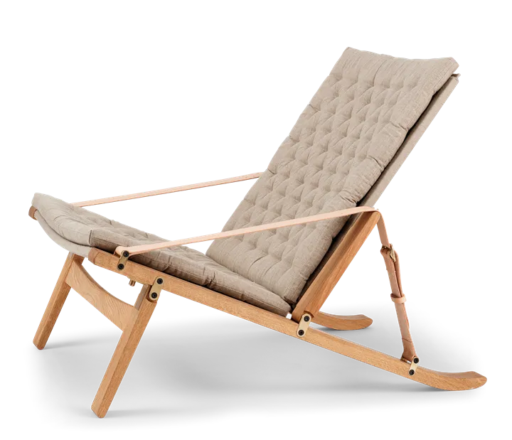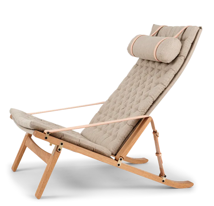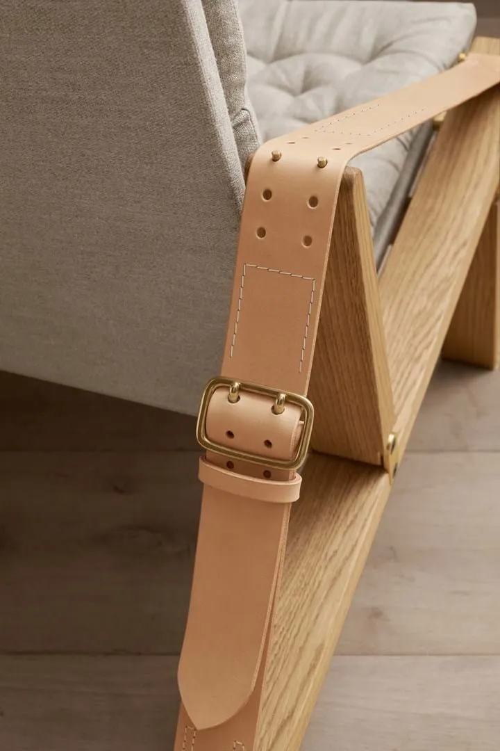 Available in a high and low back version, the solid oak frame and curved rear legs are shaped for stability. The back and seat, fitted with corresponding cushions, are upholstered in stitched linen canvas to provide an elegant expression and supreme sitting comfort. The adjustable backrest folds completely and saddle leather armrests complete the design, giving it a distinctive expression full of character.