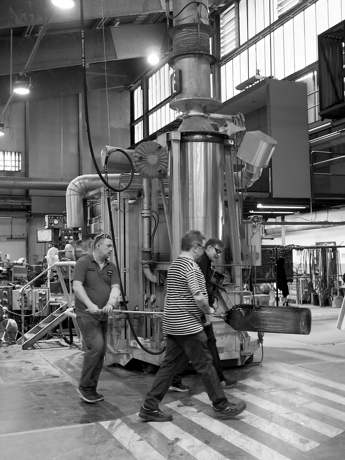 The building designed by Friedrich August Stühler in 1866 has an impressive scale that demands an interior where the objects have quite a size to not vanish. With the competition in Iittala in mind I therefore turned to them with a challenge for their team of blowers. It was a lamp design without a specific height. From a tube shaped mold the blowers under guidance by undisputed champions Heikki Punkkari and Risto Sipilä made a series of glass tubes that afterwards were cut on various heights depending on how high they managed to blow each piece.