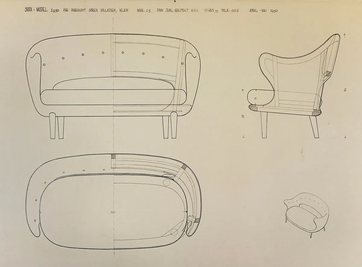 Finn Juhl’s original drawings of the Willadsen Sofa, then known as SW 50. Photo: Designmuseum Danmark.