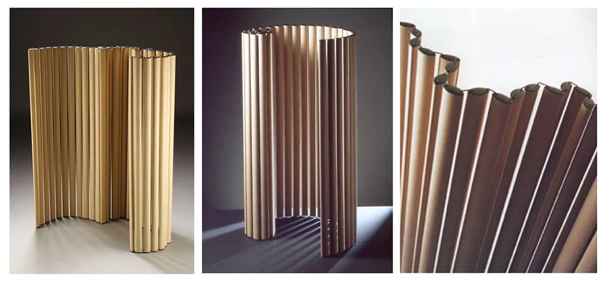 The screen “Viper” consists of a number of oval cardboard tubes which are connected and able to take on a lot of different shapes. It is moveable and very handy in offices, banks, exhibitions etc. The material cardboard is very honest and environmentally compatible, and therefore, I find it very suitable to work with. Also the top and bottom mountings on the screen is quite special and suit the cardboard very well.