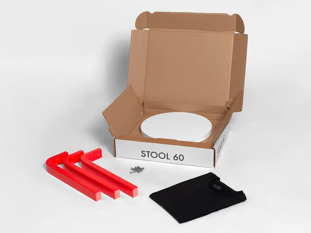 21 Questions pairs the timeless stool with a bespoke t-shirt whose labels feature 21 selected excerpts from David and Peter’s Questions, which was awarded the Golden Lion at the 50th Venice Biennale in 2003.