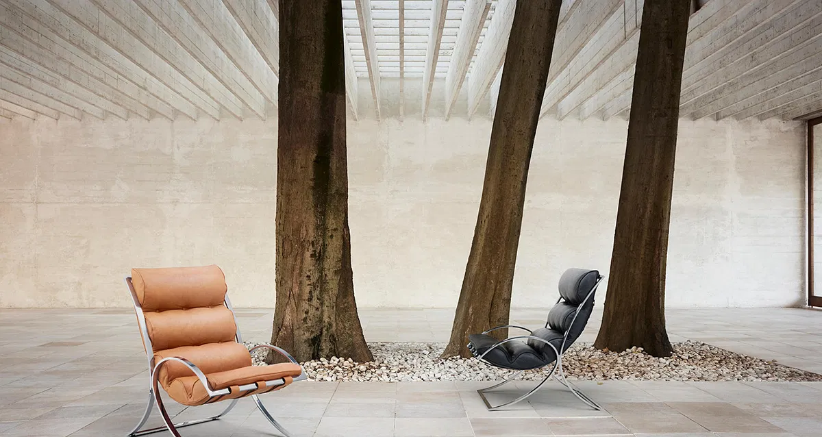 The Norwegian architect Sverre Fehn (1924-2009) was a philosophical furniture designer. His designs feel like a room within the room, created to embrace the body and be a place for contemplation. Fehn wanted people to sit down and be at one with both the architectural space and the nature outside.