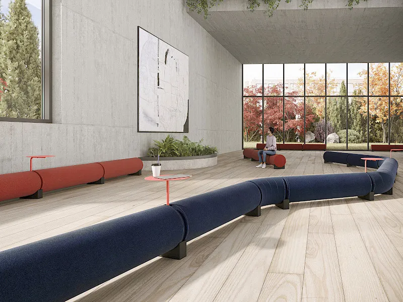 With its round shape and tactile surfaces, the modular The Tube system appears to snake its way through spaces as it provides seating for interiors of all sizes. The system consists of two parts, a straight section and curved section, each made to connect and create a wide range of shapes and configurations. Designed with flexibility in mind, the seating can be upholstered in a choice of fabrics and colours. The base is fitted with robust fasteners that secure it permanently to the surface. The Tube’s base is elevated several centimetres above the floor, making it easy to clean under and around the seating. The design makes it easy to remove upholstery for cleaning, ensuring that the seating remains in good condition over time.