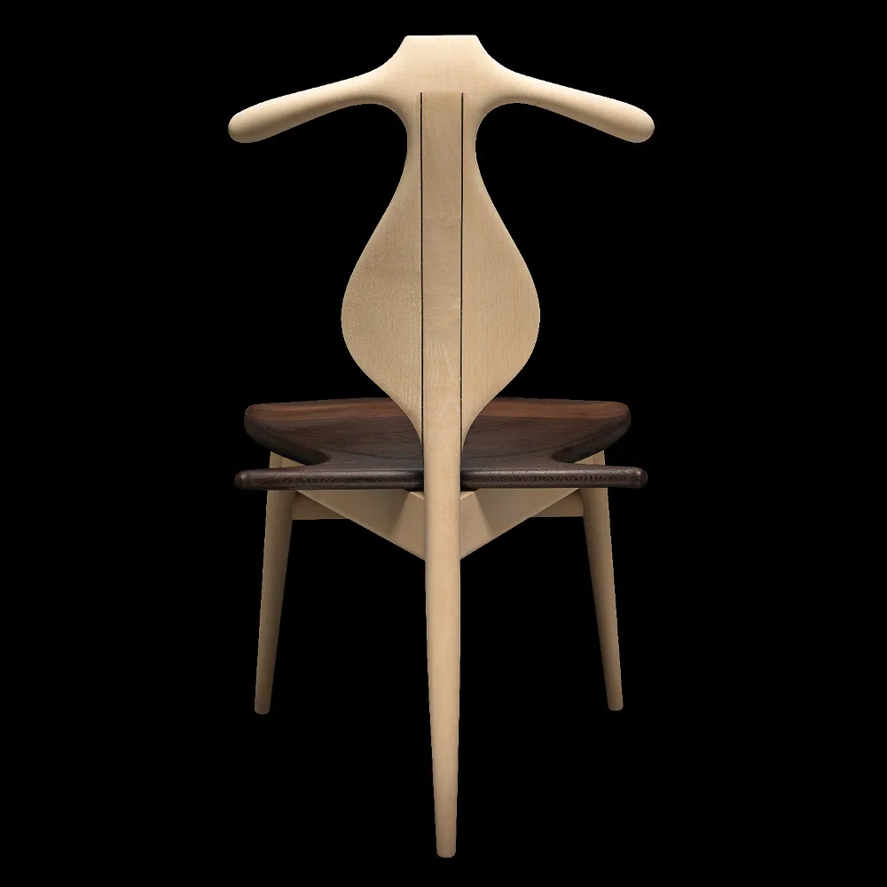 The Valet Chair is a functional sculpture that applies the traditional function of a valet stand to an elaborately crafted wooden chair. The back leg is carved in shape to offer both a comfortable backrest and a proper hanger for a jacket or a coat.