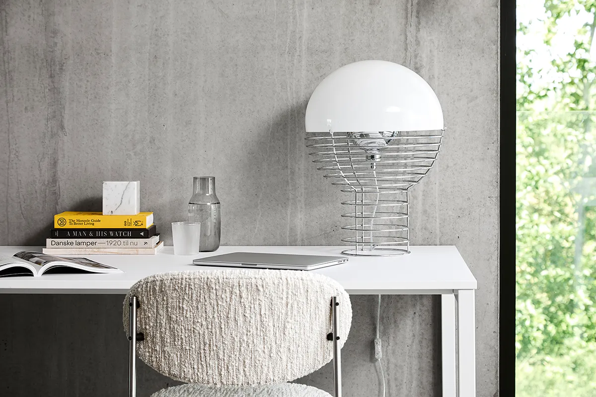 The Wire Lamp, made by Verner Panton in 1972, fascinates with its extraordinary construction principle. Soon available in a smaller edition, the Wire Table Lamp Small is the perfect size to place on your desk or by the bed.