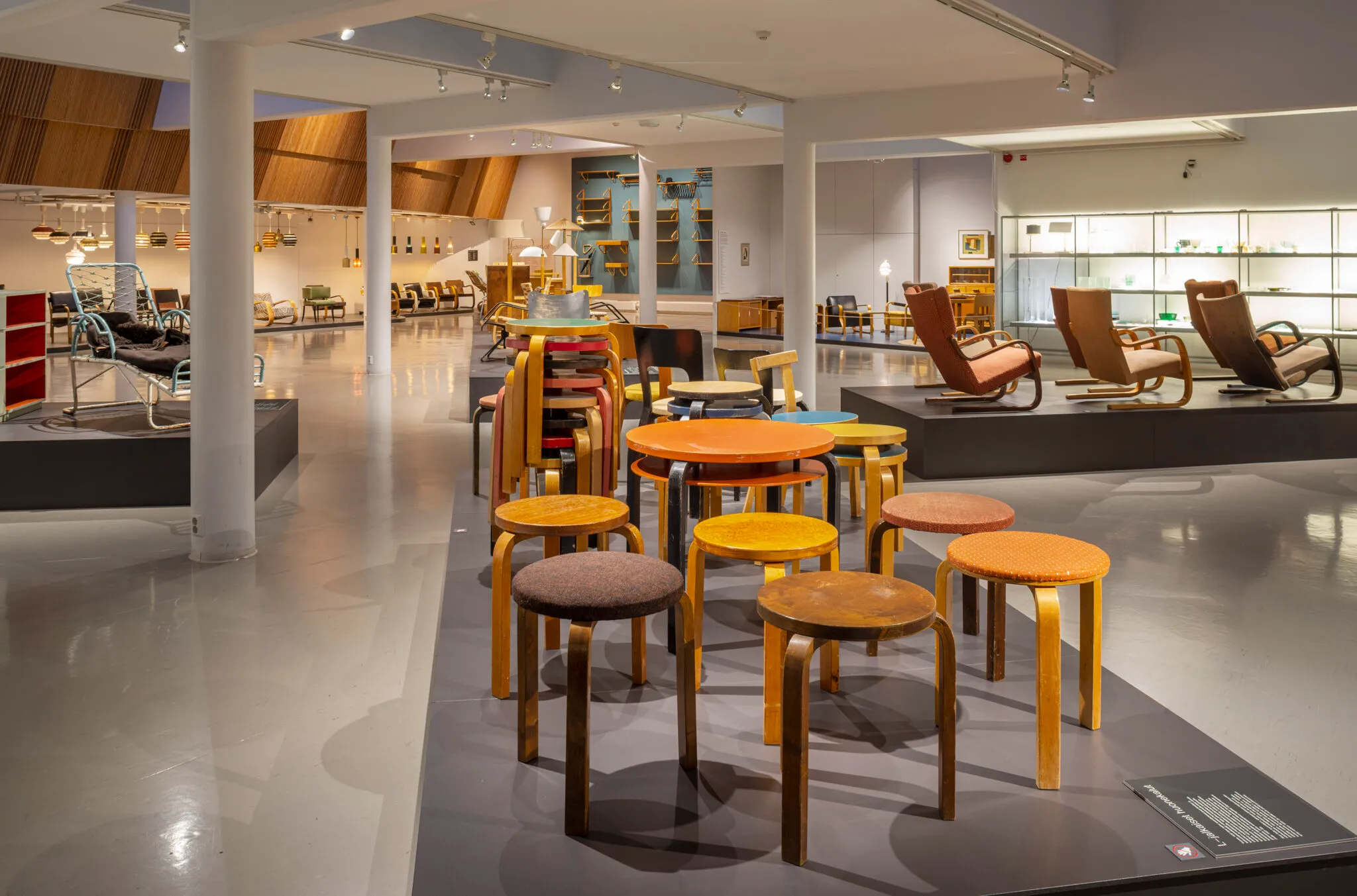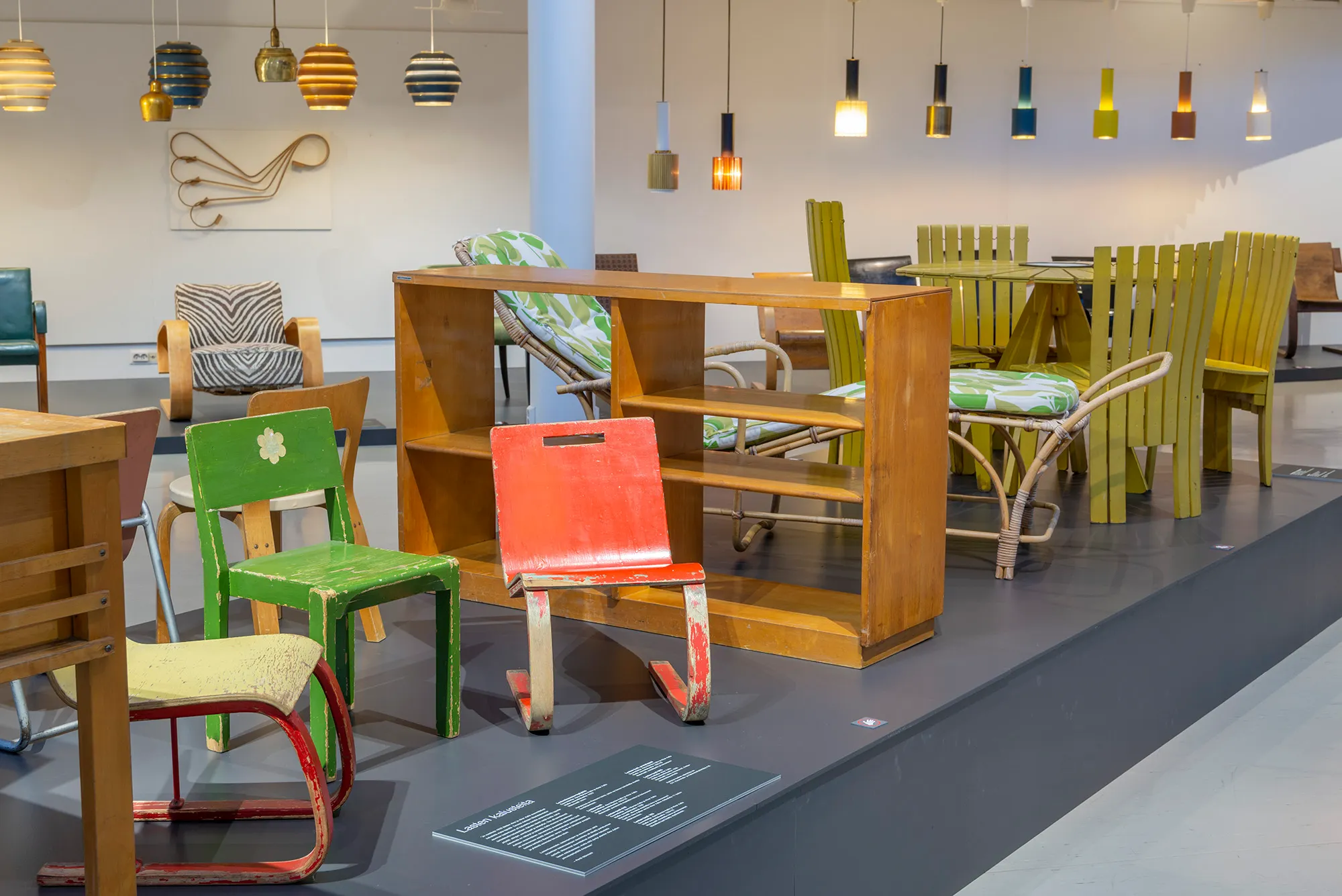 The objects brought together in this exhibition represent the very first steps in Aino and Alvar Aalto’s industrial design, from the time before true serial production and the mechanization of furniture manufacture. The different variants on the same model of furniture shed light on the arc of development of a specific object, with each item completing the whole picture of the Aaltos’ design. The interiors assembled using the furniture and lights mark the passage of time, with, for instance, a 1940s living room after the Second World War and a 1960s Artek home. The objects reflect the growing prosperity of Finnish society, which also brought new colours to the materials and upholstery fabrics used in Aalto furniture.