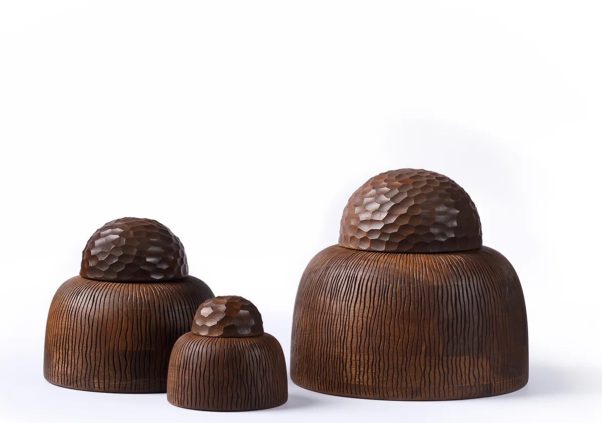 “Riccio (Italian for hedgehog) — is a tactile wooden sculpture whose softly rounded form and finely hand-carved grooves evoke the quiet strength, charm, rhythm, and organic geometry of nature.”