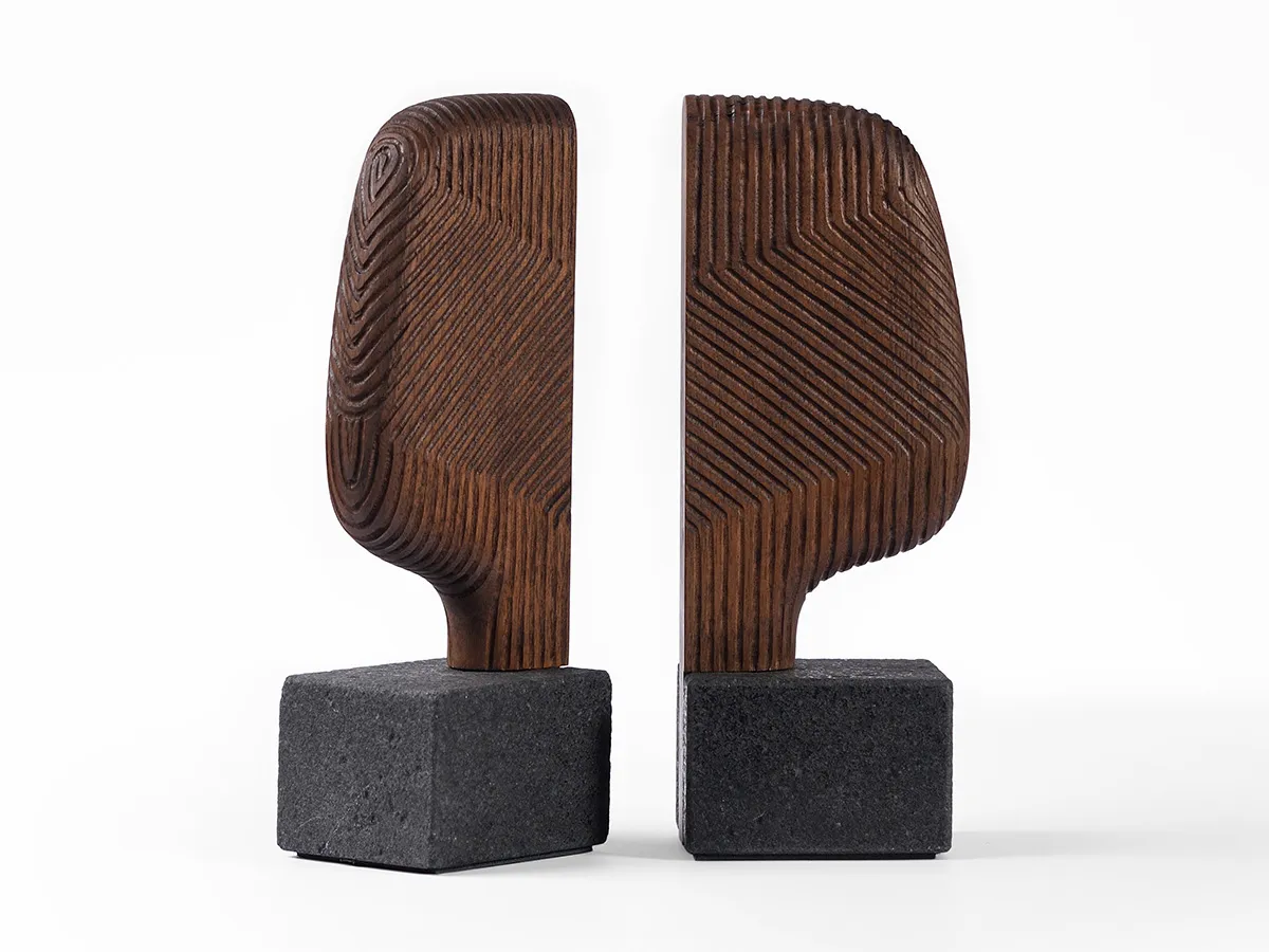 “To celebrate the 10th anniversary of the Zanat brand, I imagined this mysterious yet functional object. Perhaps an ethnic sculpture? A trophy from a vanished tribe? None of the above. I chose to design an object related to books, a bookend showcasing the craftsmanship of the park. Assembled and disassembled, the combination of two forms, which together form a totem, and when separated, perform their function. The combination of wood and stone: an earthly and symbolic force.”
