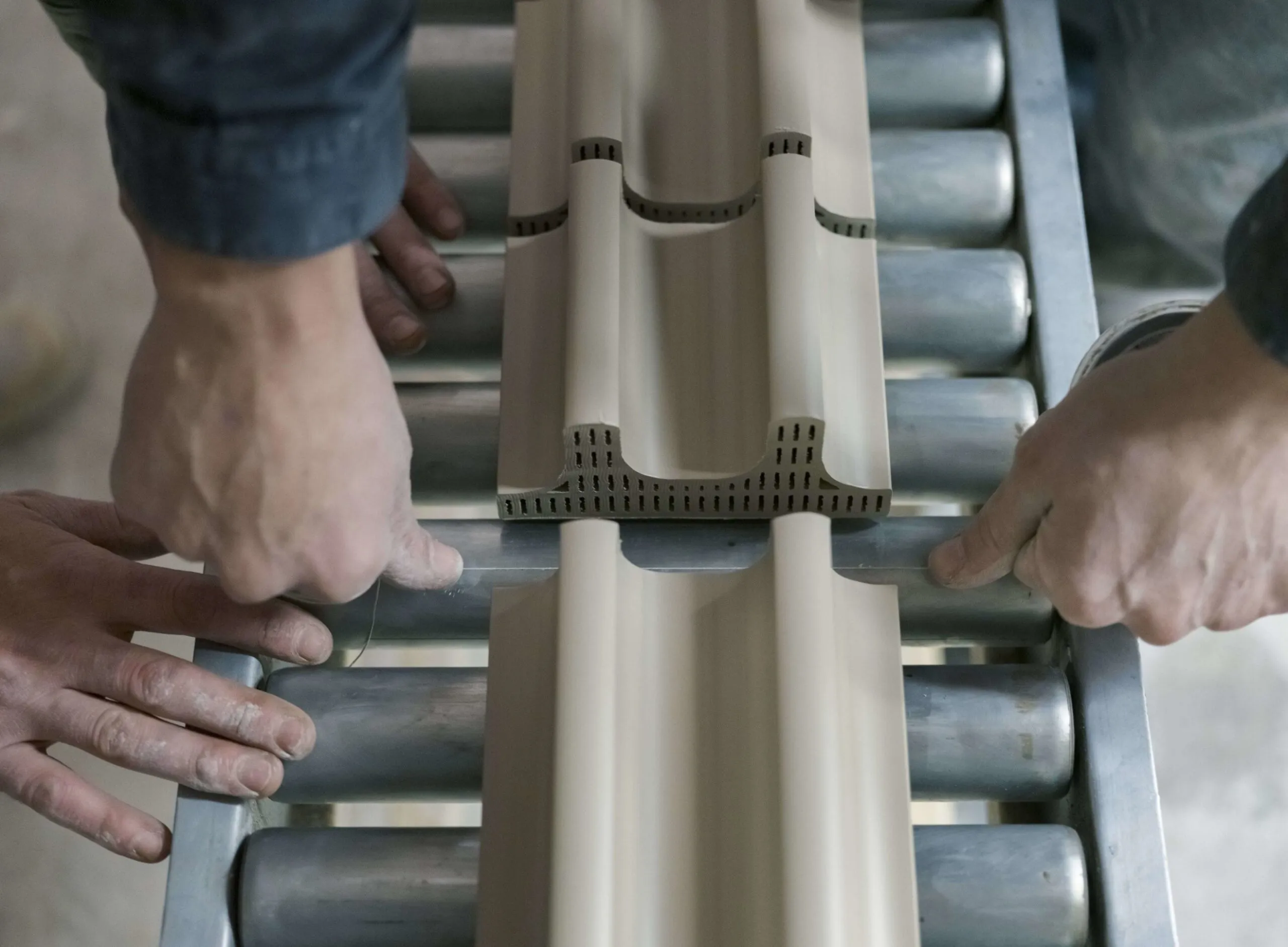 This elegance is born out of an innovative reimagining of the traditional extrusion process, in which a continuous stream of clay is passed through a shaped die, generating both external forms and internal grids. These give the clay strength, transforming a fragile, dense material into a durable, lightweight one. Each product is unique, cut by hand from the extruded clay as it flows from the machine, then dried, fired and glazed.