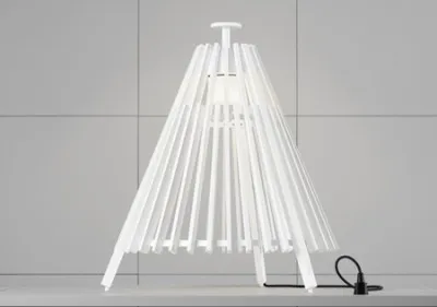 Tipi is a floorlight for both outdoor and indoor use, made from slats of heat-treated ash. The arrangement of the wooden slats around a stainless steel circular structure is reminiscent of the Native American teepee as well as the Swedish Samis’ “kåta”. Hence the name. Tipi comes in two versions: a heat-treated natural wood, which goes greyer with time and a white lacquer that lets the grain show through. Recommended light source is a LED-bulb with E27 fitting. Design: Mårten and Gustav Cyrén.
