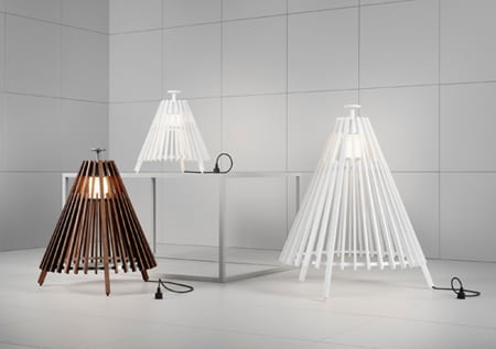 Tipi is a floorlight for both outdoor and indoor use, made from slats of heat-treated ash. The arrangement of the wooden slats around a stainless steel circular structure is reminiscent of the Native American teepee as well as the Swedish Samis’ “kåta”. Hence the name. Tipi comes in two versions: a heat-treated natural wood, which goes greyer with time and a white lacquer that lets the grain show through. Recommended light source is a LED-bulb with E27 fitting. Design: Mårten and Gustav Cyrén.