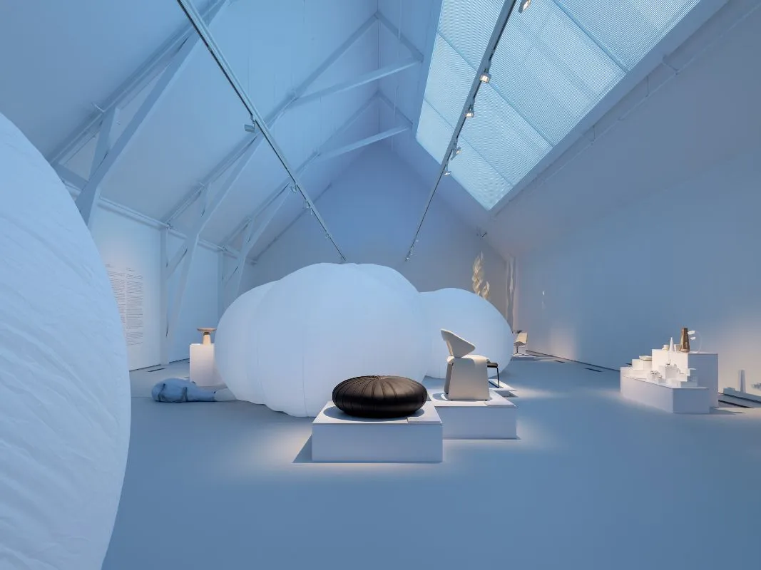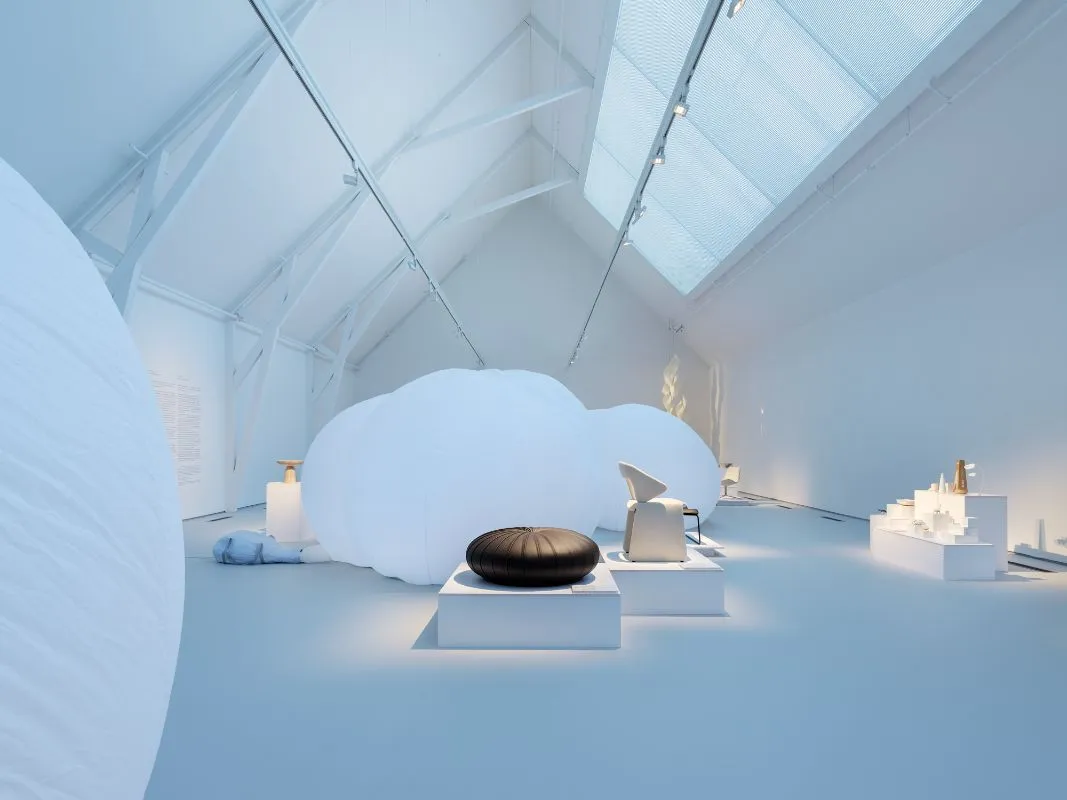 In the exhibition the visitor is given an insight into the studio’s creative process. The visitor is guided through a landscape of idea-clouds, process and results. The inflatable Cloud symbolises ideas and the result and process is displayed on podiums inspired by the studio’s presentation boxes. The naturally changing light in the room is amplified by the lighting designed by Kai Piippo and creates a feeling of walking among the clouds.