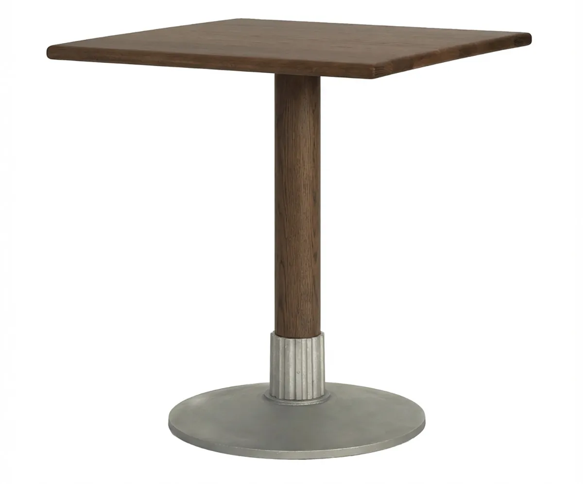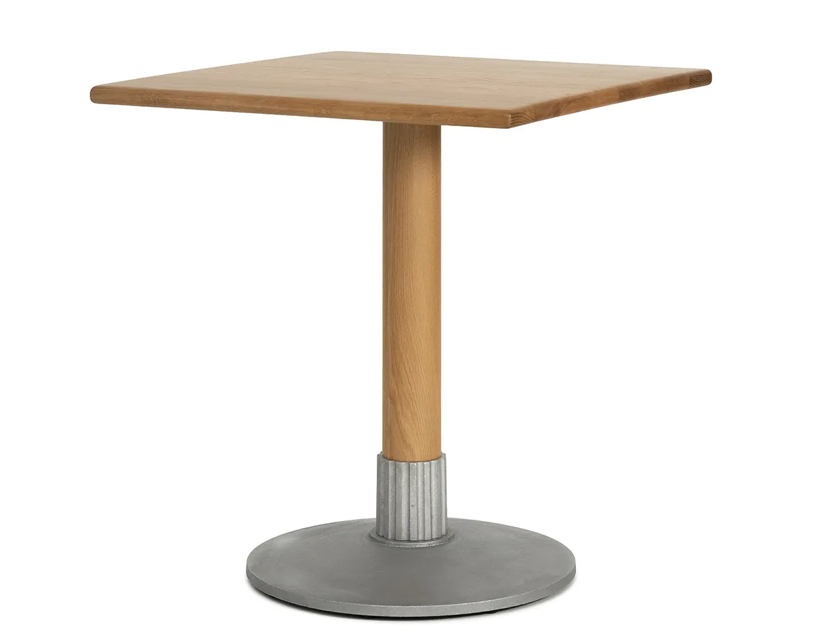 Made in massive certified European oak reinforced with trusty steel bars, Tock offers even more. Anna Kraitz has crafted a knurled inset for the base in recycled aluminum, a reminiscence of industrial mechanical hardware. The table sits ponderously stable with a firm foot in the past and a modern appearance probing the future. Gone are cast-iron ornamental bases replaced with a brushed surface and a distinct form.