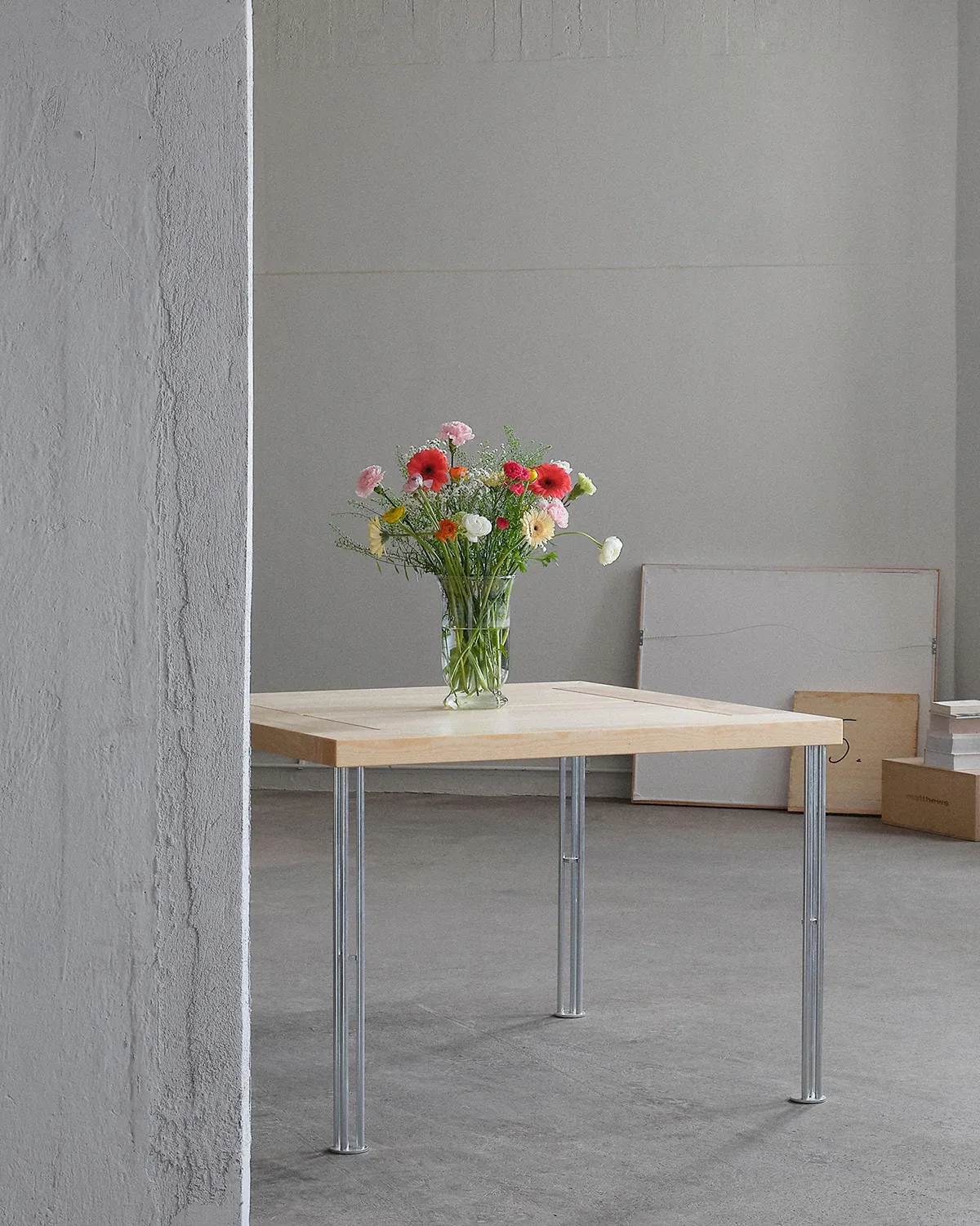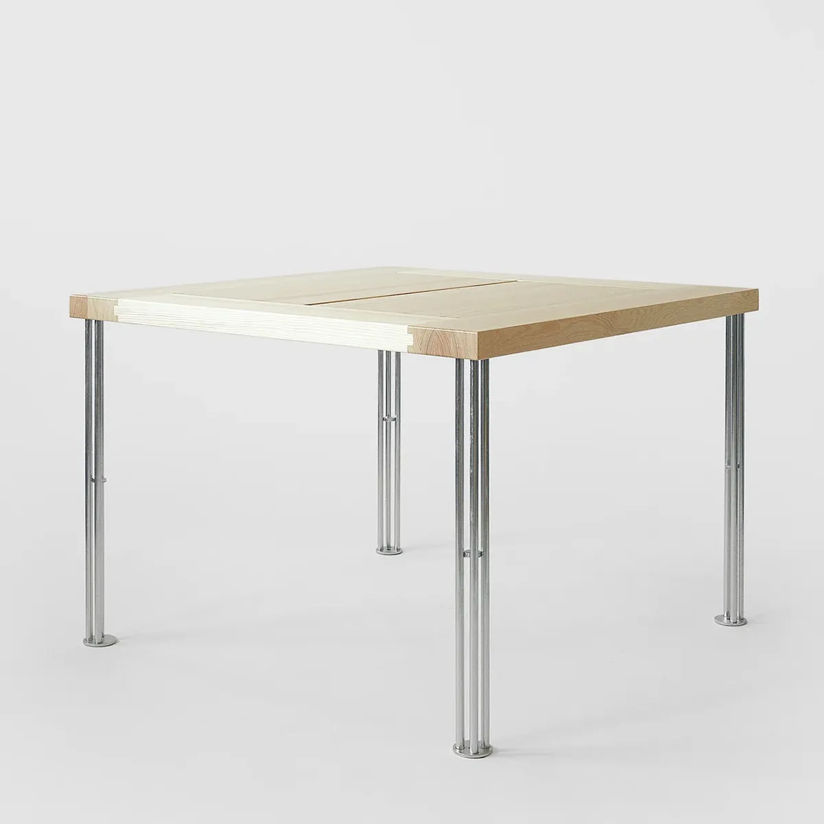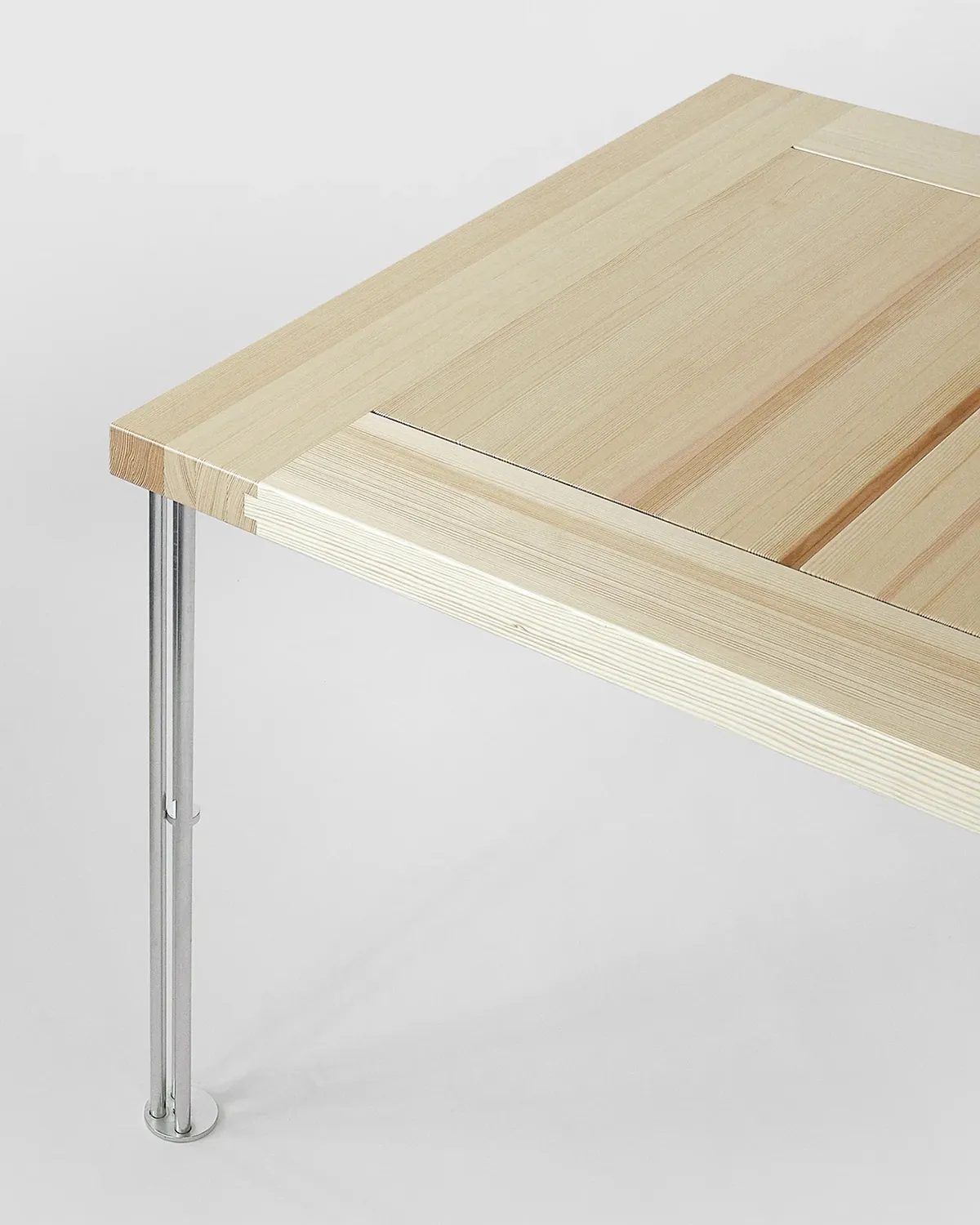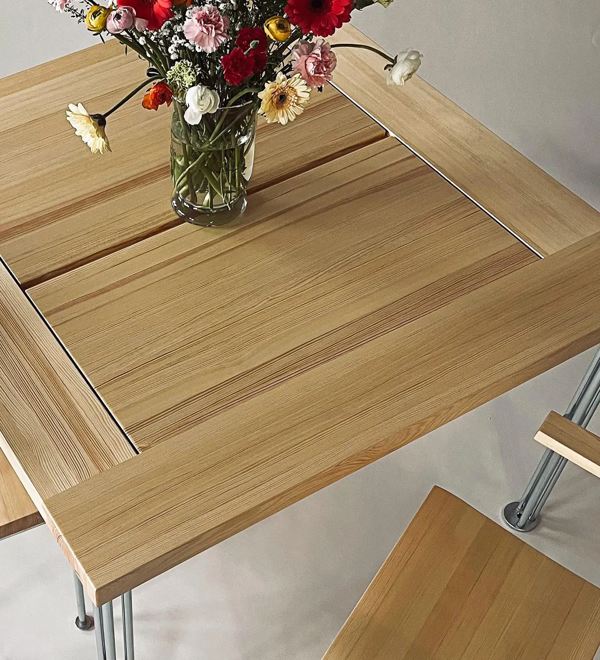 The 45 mm thick tabletop is constructed from knotless glulam wood made from solid pine. The table is delivered unassembled, and the legs are fastened to the tabletop using slotted brass screws.