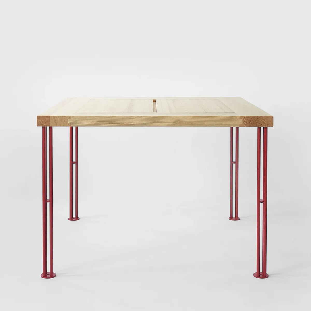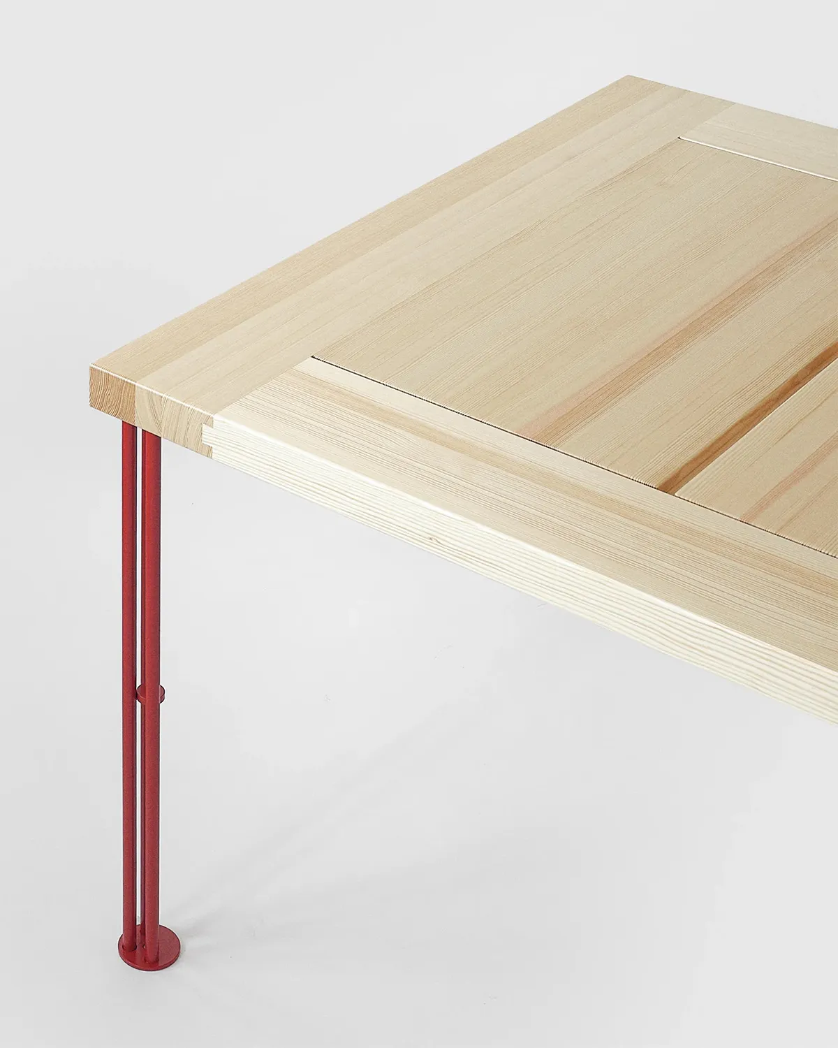 The original collection was made of varnished glulam (pine) and painted steel (tomato red). Tallum provides the original version, and a version made in electroplated steel.