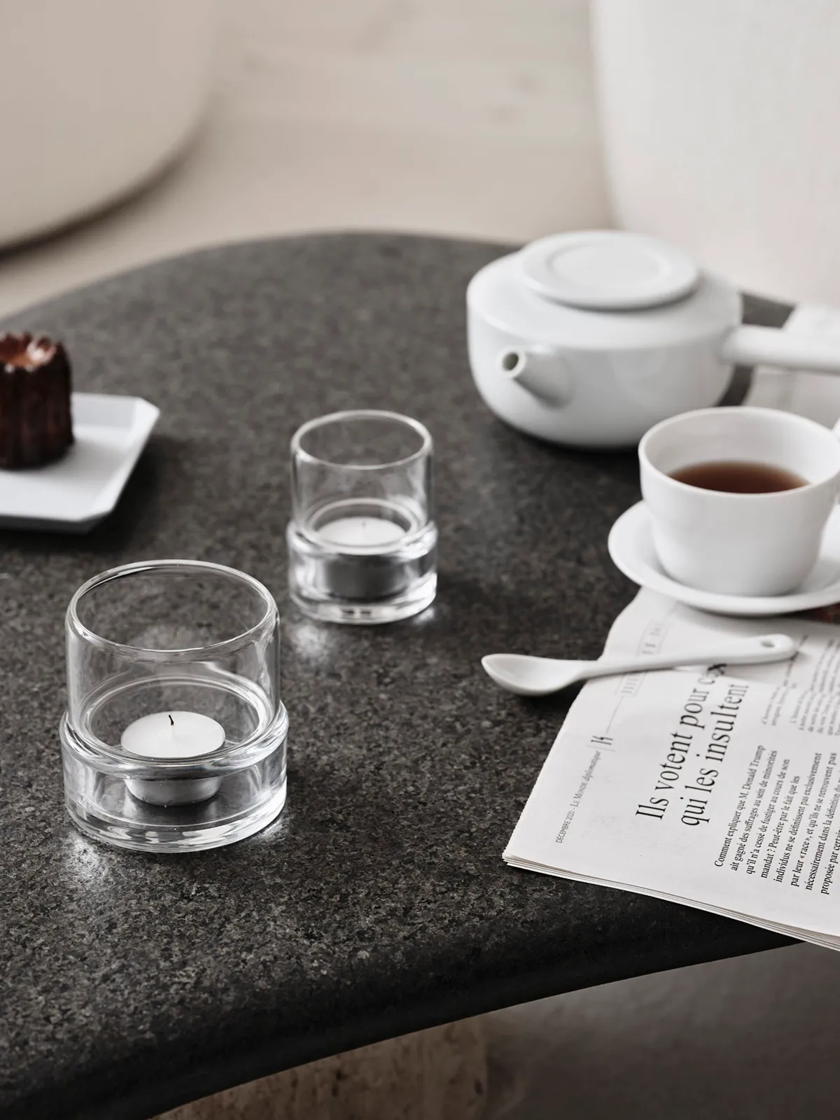 The collection – two votives and one hurricane lamp – is made in a two-part design that combines functionality and minimalistic lines. The hurricane lamp fits both indoors and outdoors and is intended for either pillar candles or classic candles (a functional metal holder is included).