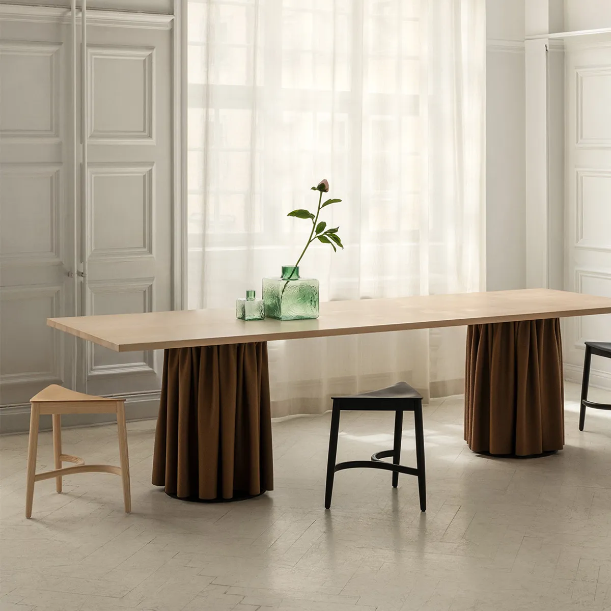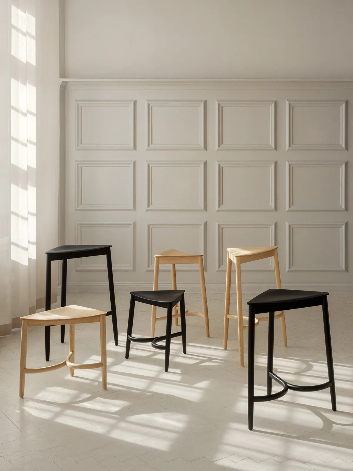 The stools come in natural ash, oak and in black lacquer.