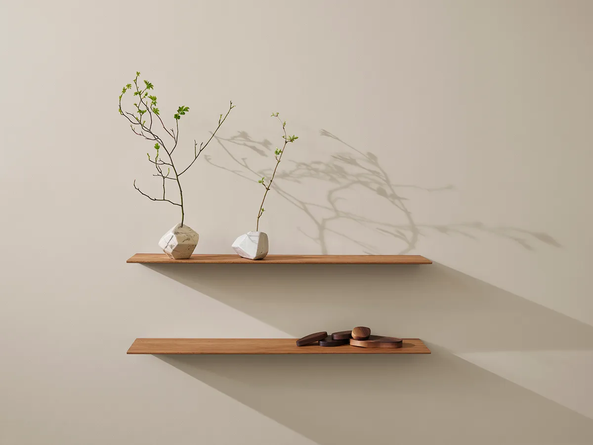 Behind the Tsugi Shelf’s simple expression lies sophisticated, high-precision carpentry, ensuring that the mechanism locks seamlessly together without visible transitions. As a practical detail, a recess milled in the shelf ensures that picture frames, books and other objects can stand securely.
