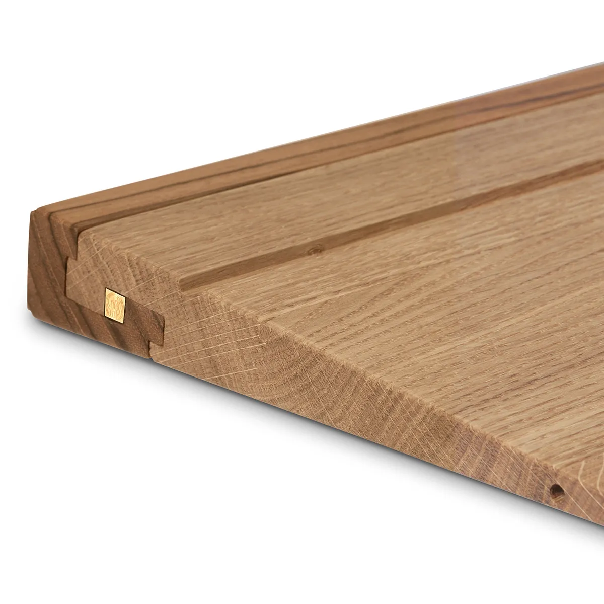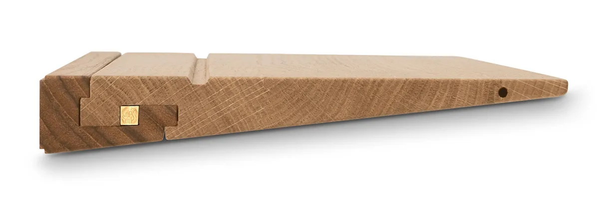 The shelf’s Japanese name, Tsugi, refers to the method of craftsmanship in which the shelf and wall mount are firmly interlocked by a brass peg. This traditional form of joinery was developed in 12th-century Japan to keep the wood as intact as possible by not using nails. Not only does the Tsugi joint firmly stabilise the shelf, it also infuses a distinctive detail into the design.