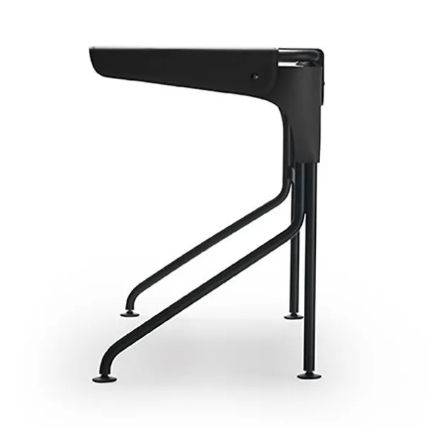The matte black tubular steel structure draws a continuous profile and creates the support for the thin top, made with a single piece of leather that rests on the structure, leaving only some parts uncovered.