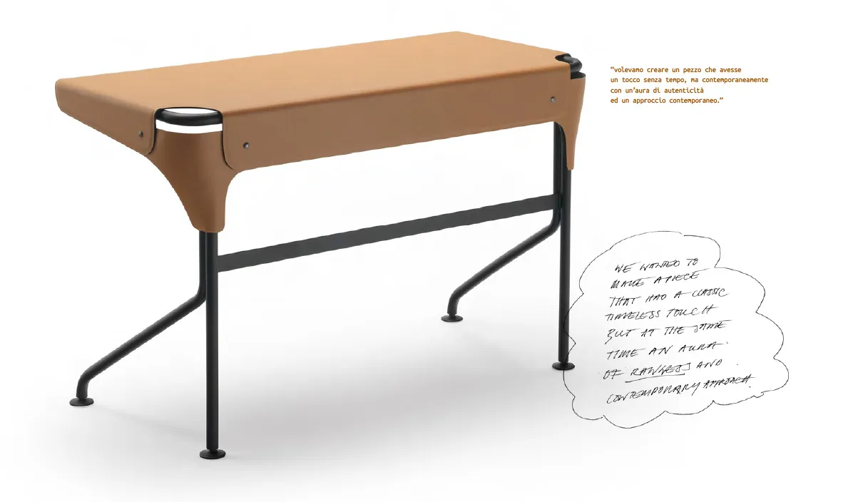 A discreet, elegant, sculptural desk, an expression of refined simplicity and design synthesis. Attention to detail can be found in the visible rivets placed on the corner joints and in the new way of processing the leather whereby the thickness is tapered to create a depression that runs along the entire perimeter of the surface top.