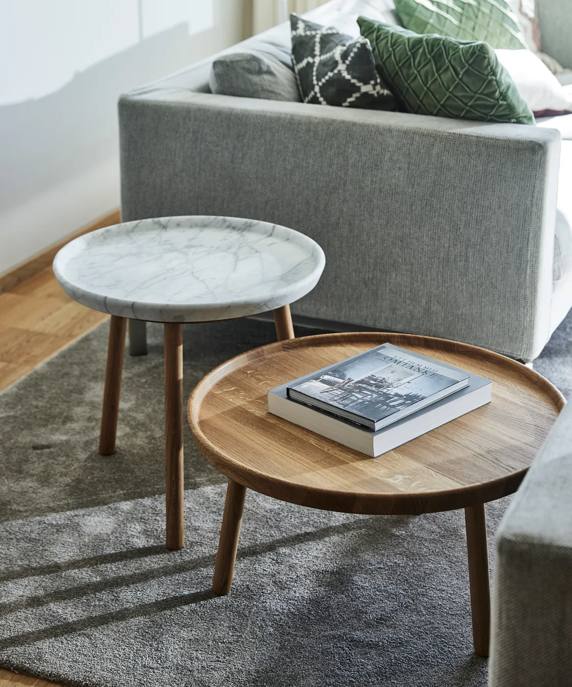 We’ve added two new heights to our wonderful Tureen table range, designed by Jonas Lindvall. The tables can be used as nesting or freestanding tables and are now available in the following heights: 29 (new), 36 (new), 43, 50 and 57 cm. The table tops are made of three different materials: Verde Alpin, green, Ø 38 cm, Cararra marble, white, Ø 52 cm, and solid oak Ø 38, 52 and 65 cm. In other words, all table tops are available in solid oak. The legs are made of solid oak.