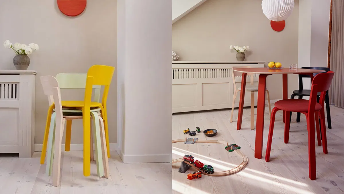 - Available in five finishes of EU-grown beech, Turn Table and Turn Chair comes in Matt water-based lacquer (natural beech), Japan red, Black blue, Copper green and Sun yellow.