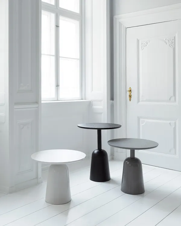 Turn is well-suited for use as a coffee or side table and can be placed on its own or in a group of small tables in a living room, lounge area, lobby or hotel room. The ash veneer tabletop is lacquered in the same color as the steel base. The table comes in three monochrome tones of black, dark gray and a lighter, warm gray, allowing Turn to blend in elegantly with different interior designs.