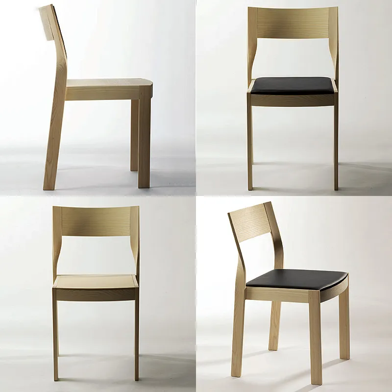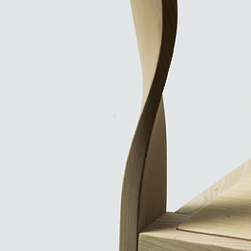 A basic, comfortable and light wooden chair with a blend of strong personality and straight forward elegance. By giving a twist to the back leg the chair gets an inviting and ergonomic backrest. The shape plays with the fibres of the wood and communicates the personality of the chair. The twist is achieved by solid wood, shaped in a computerized cnc router.