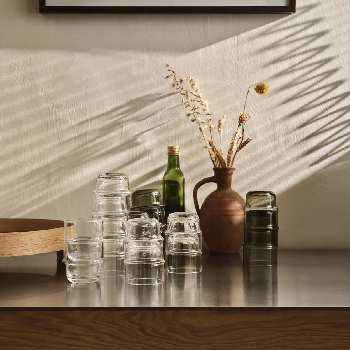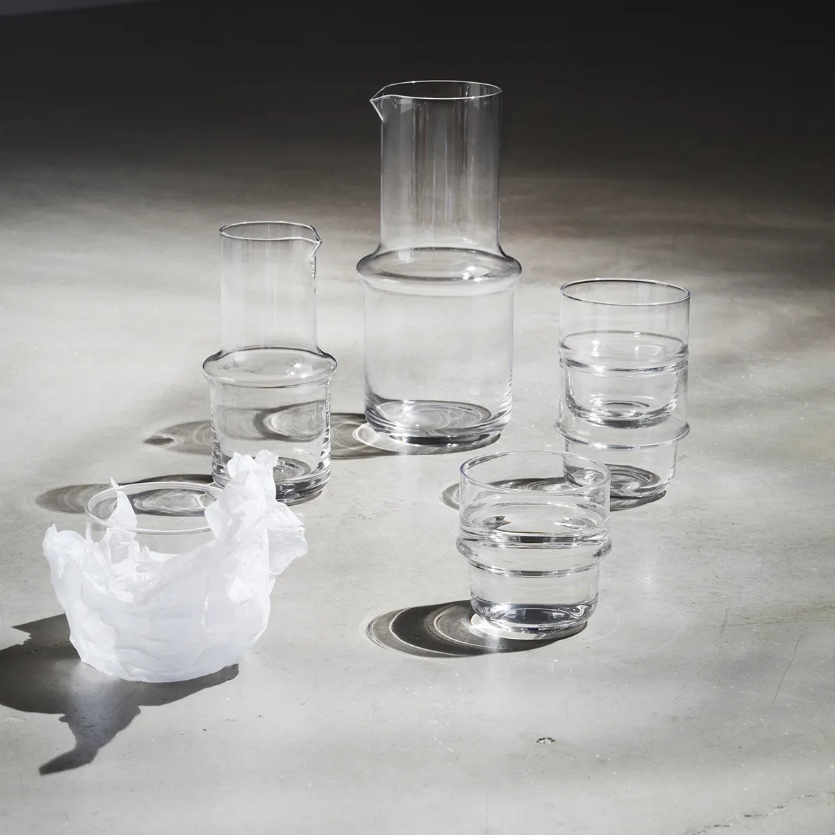 Drinking glasses are very emotive products in that they meet with people’s hands and mouths, and great effort has been put into finding the right shape and feeling for this meeting. The classic shape has been adorned with a ripple on the side. It’s a wave that catches the fingers and plays with the hand, while allowing practical stacking as the glasses never get stuck together.
