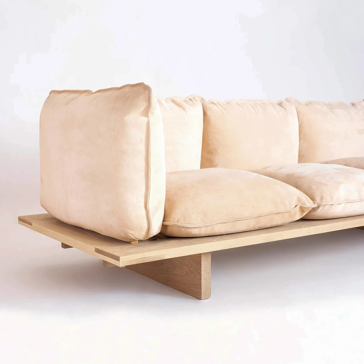 Made exclusively of solid Swedish oak. Unique to the sofa are its seat cushions, which are strung over a sturdy glulam construction, giving the impression that they are standing by themselves above the exterior frame. The lack of an external supporting structure at the end and back gives the sofa an airy and spontaneous expression. Seat and back cushions in ecologically tanned Swedish leather or traceable, ecological split leather in natural colour. The cushion are stuffed with Swedish texel wool. Can be purchased untreated or treated with natural linseed oil.