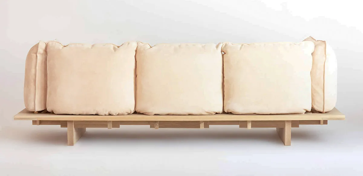 Unique to the sofa are its seat cushions, which are strung over a sturdy glulam construction design by Verk Projects