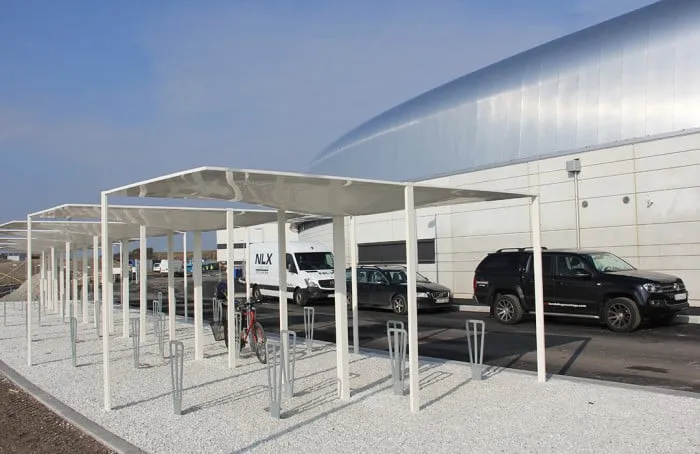 Våg (Wave) is a new, modern bicycle roof in fiberglass, developed new MAX IV Laboratory at Lund. With its lightweight, simple design gives it a vague impression. The roof protects from weather and directs at the same time place. Works great with the bike bollard Duo with approx six per roof. Våg bicycle roof can easily sections adapted to fit into the environment. Designed by Jenny Osuldsen by Snøhetta Architects.