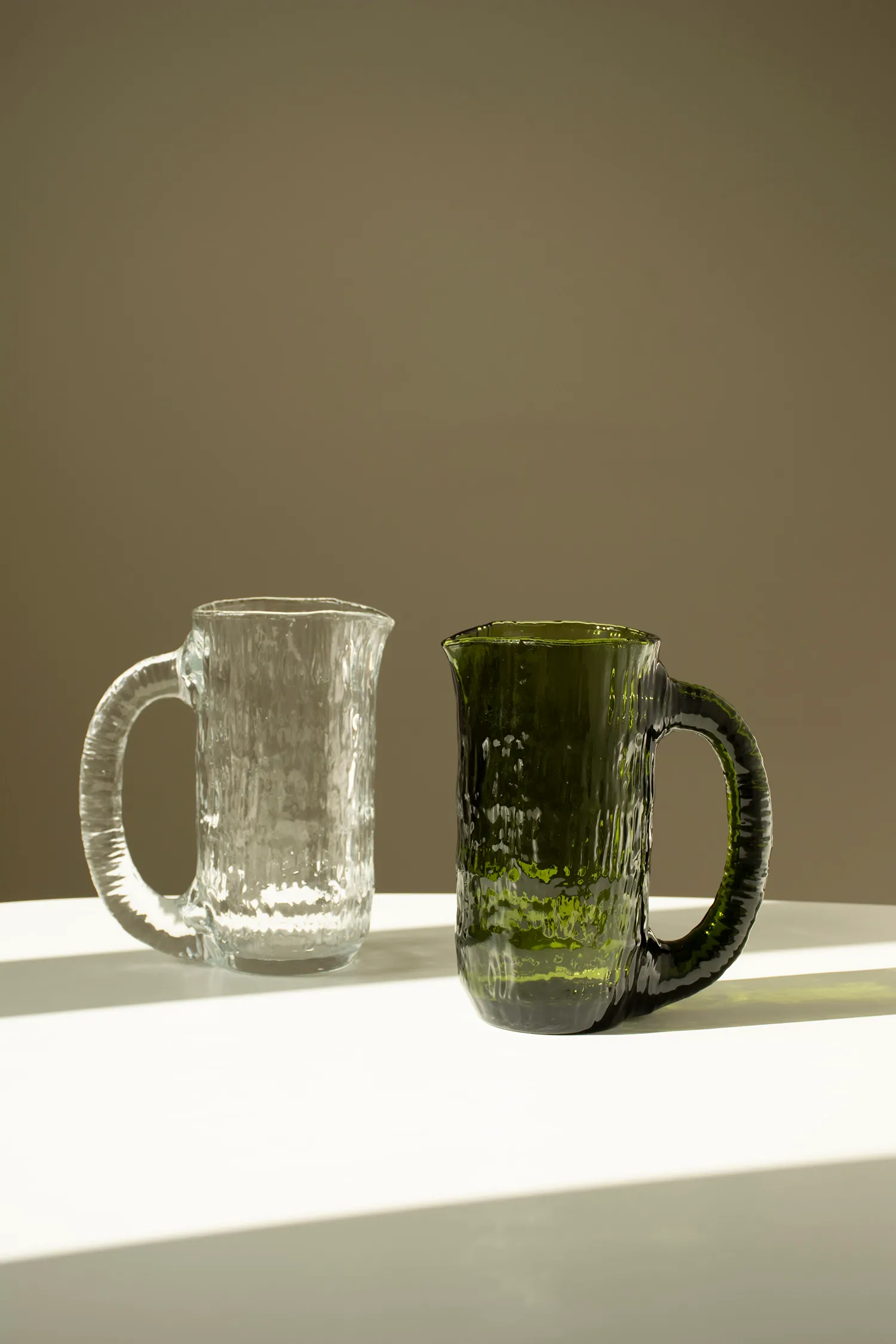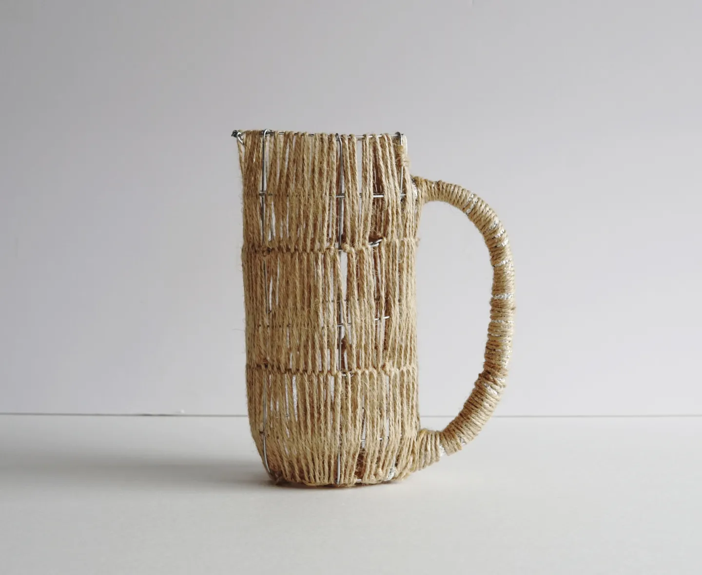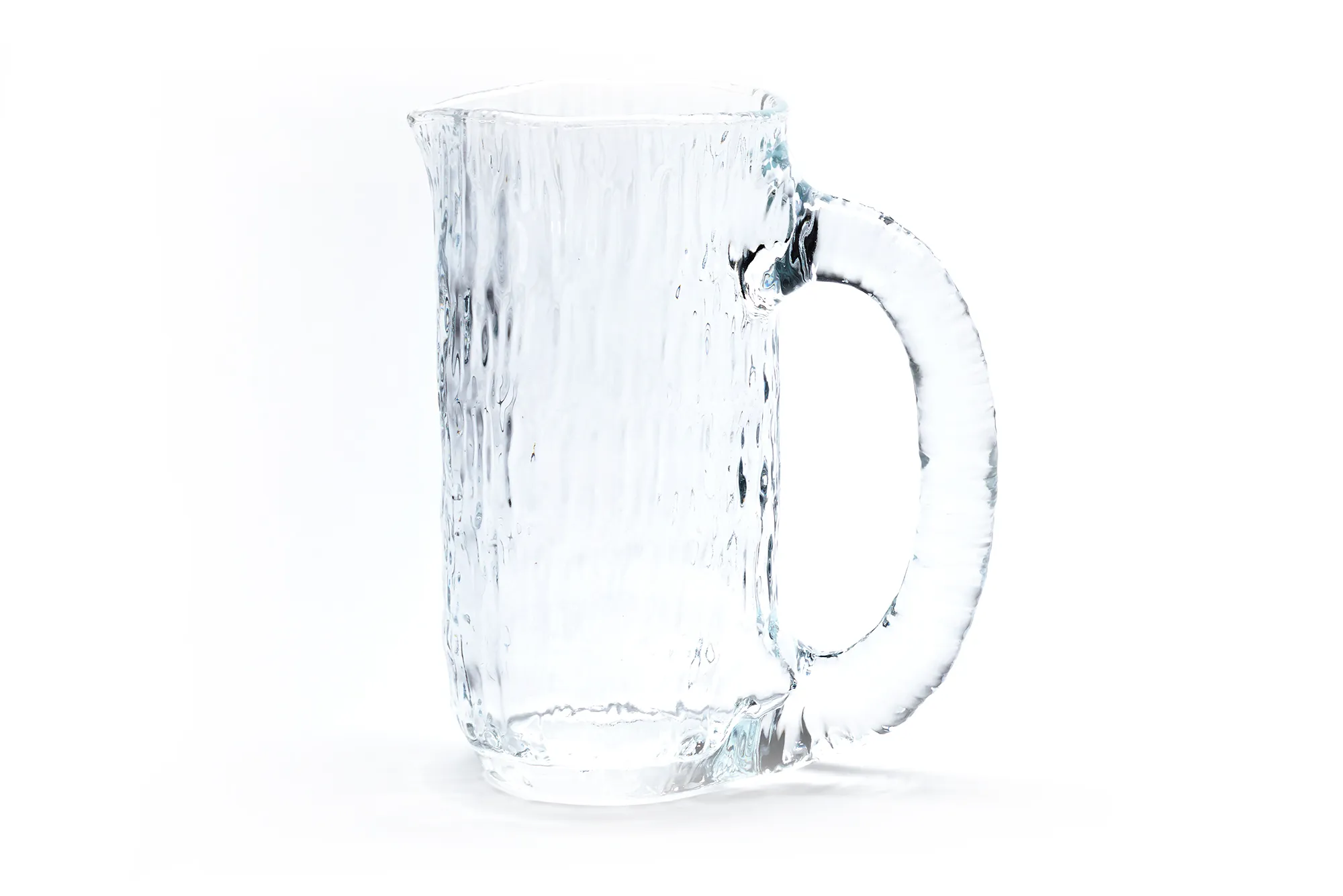 The project started with this kind of design briefing, “Daily necessities indicating the charm of sculpture”. We tried to express the attractiveness of random and asymmetry hidden in the prototype model and its process by mass production products. First, Wraping a rope around a frame made of wire, and apply fibrous clay dissolved in water. A prototype model made by hand was scanned with beautiful aspects as three-dimensional data in a 3D studio, Then a metal tooling was produced by CNC cutting based on the three-dimensional data. At the end, we replaced the material with glass and manufactured water jugs using a combination of blown glass and injection molding.