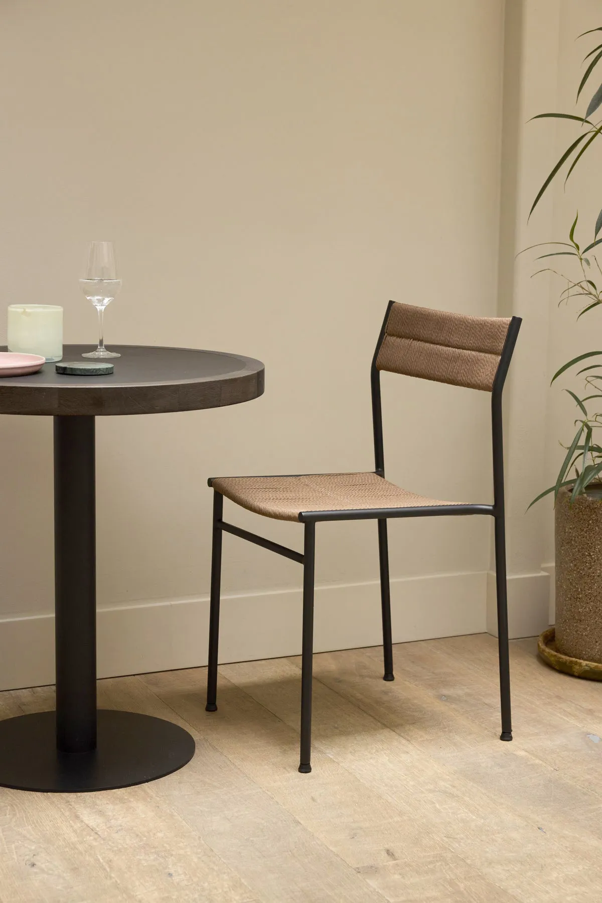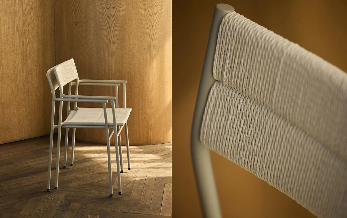 Both the side chair and armchair are stackable—six highwithout a trolley—and lightweight, making them perfect fortight homes, lively cafés, or modern office spaces. Offeredin two finishes (matte black base with deep brown rope orwarm grey-beige base with natural rope), Vev features arecognizable silhouette and strong character, seamlesslyfitting into private and public spaces alike.