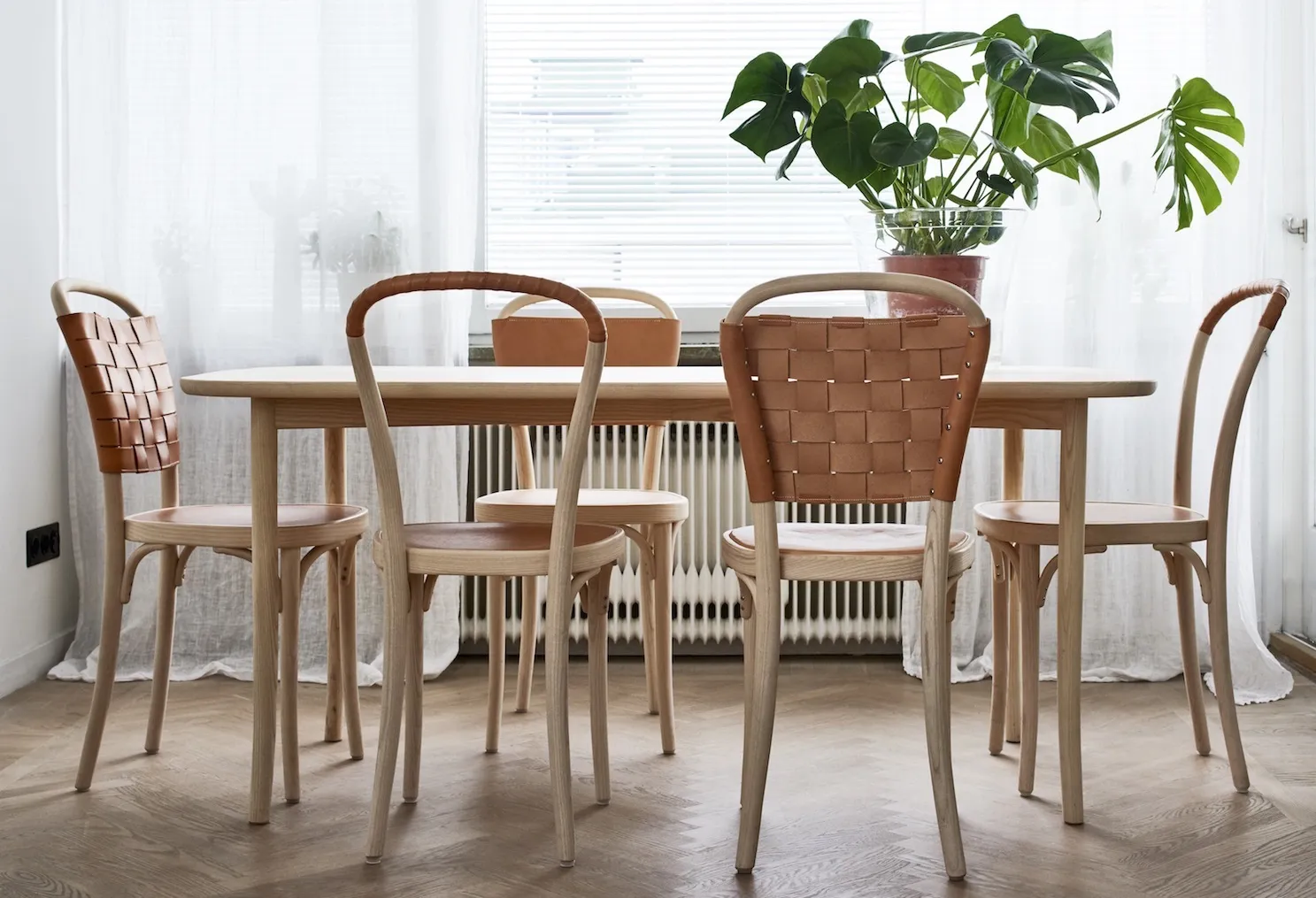 The classic café chair in a modern design, where the natural bent wood meets the vegetable tanned leather.