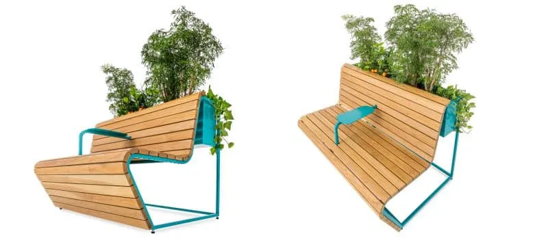 This backed bench can be ordered with an integrated planter, making it a multipurpose, space-saving design that brings nature indoors. The bench is formed by crisp folds that create the seat and backrest, hide the legs, and conceal the planter integrated into the frame. Viewed from the front, the bench appears to balance weightlessly on the bottom edge, but is anchored to the ground by the metal frame that supports it. The bench’s generous size makes it a natural space divider, and the presence of flowers and shrubs in the planter adds an attractive focal point. Made in Sioo-treated oak and underpinned by steel parts, the bench/planter is virtually maintenance free