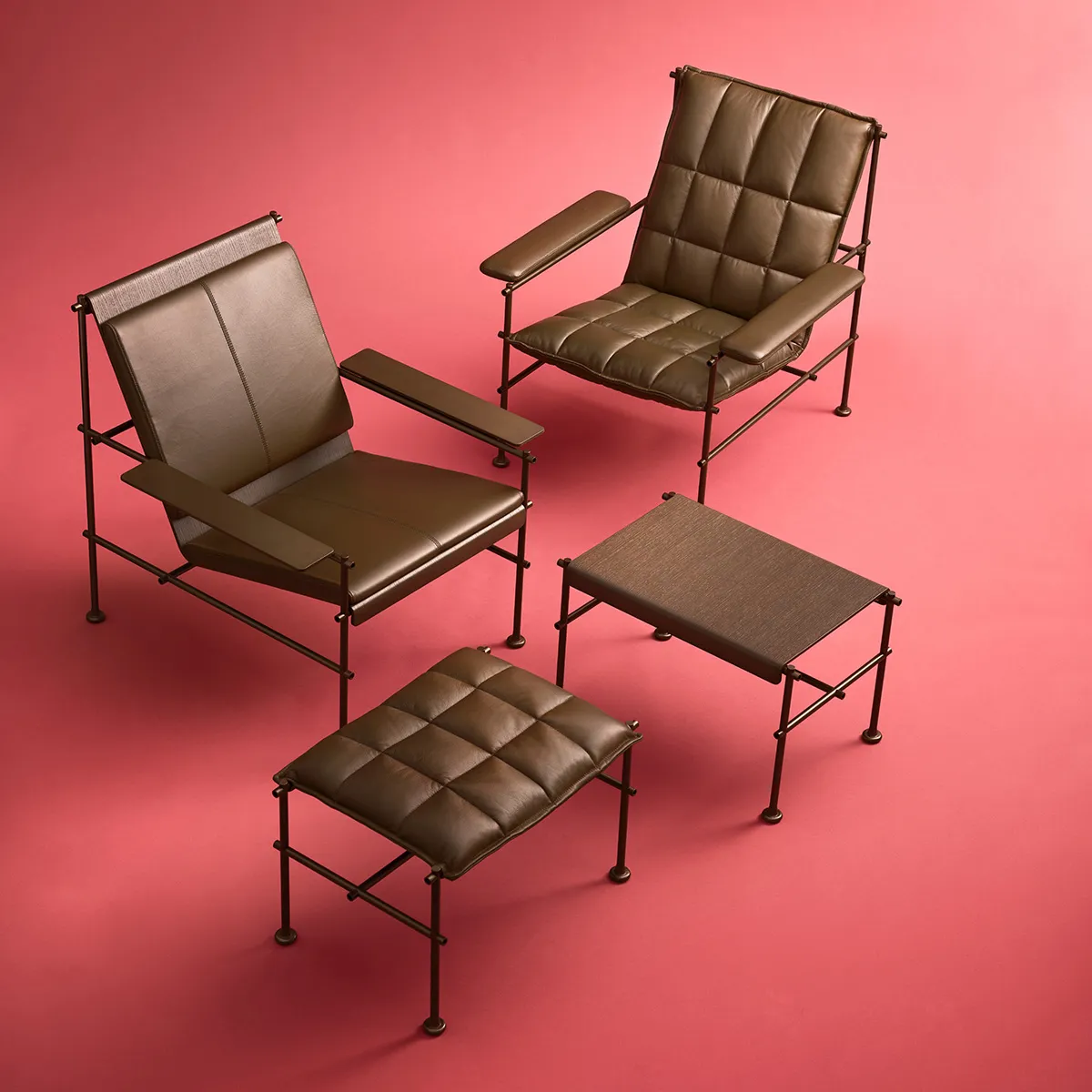 We are now taking Villhem further into the future by adding a low‑back armchair and a footstool. Or rather: two armchairs and two footstools, as they follow the existing alphabet. One version in compression‑moulded, layer‑glued wood, and one Supersoft version with a steel inner frame, nozag springs, and leather upholstery.