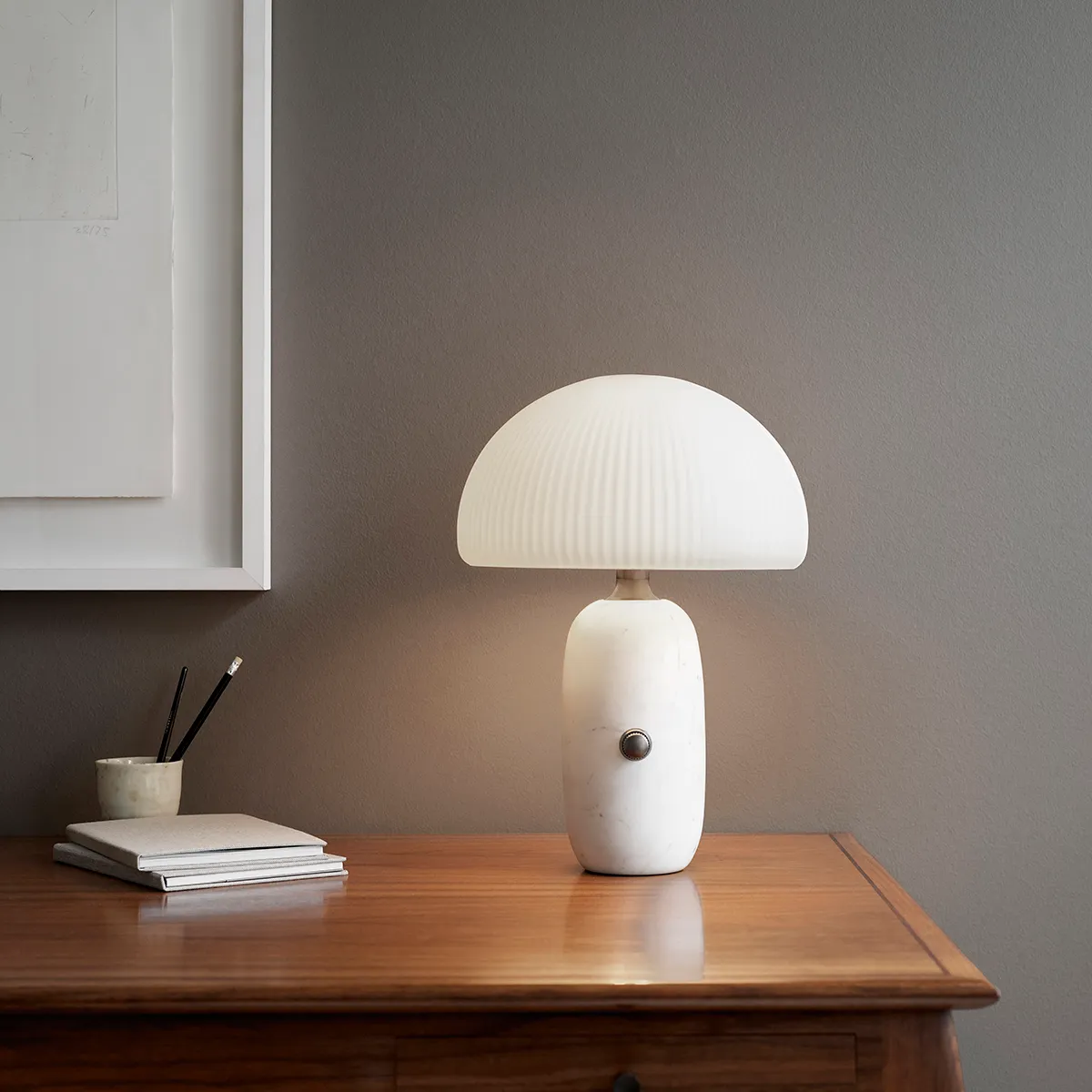 The Vipp Sculpture lamp is named after its sculptural appearance. The lamp features a mushroom shaped, reeded glass dome crafted by using ancient mouth blowing techniques.