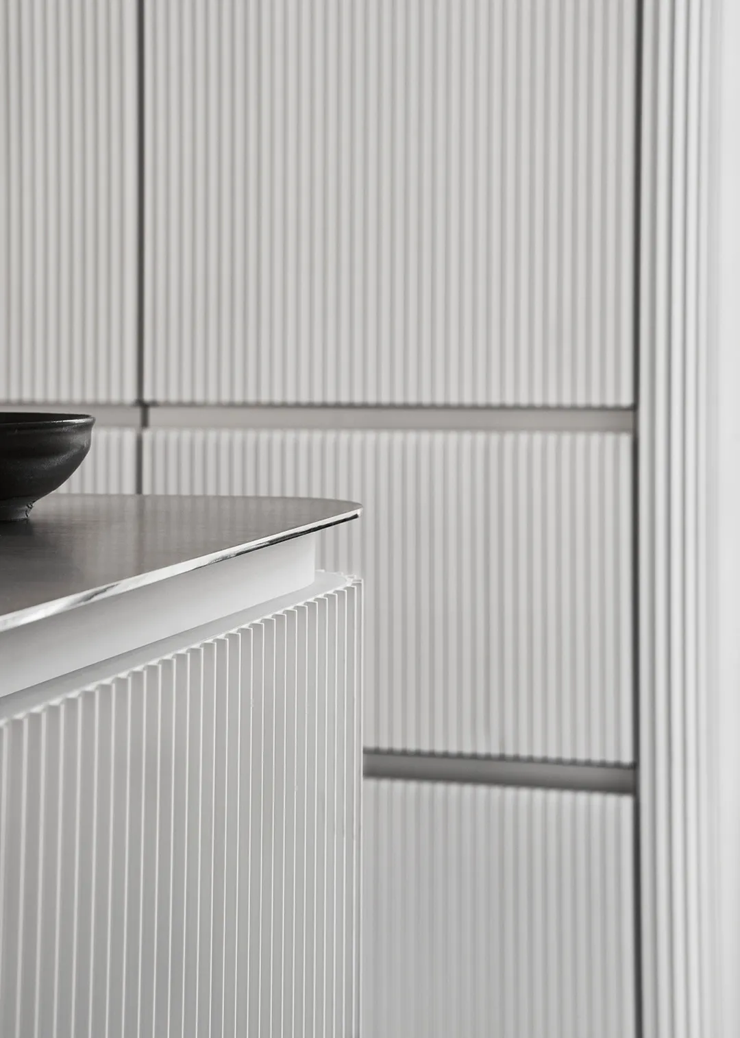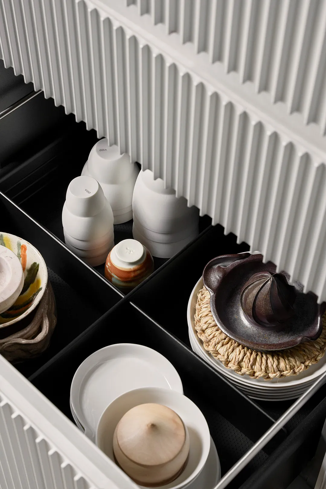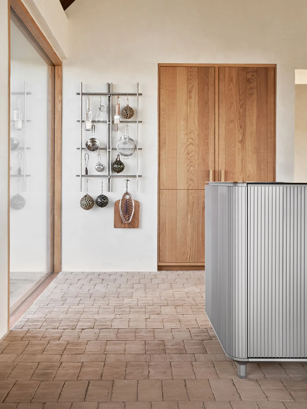 Inspired by one of Vipp trademark materials – extruded aluminium, the siding and rounded edges offer a unique aesthetic, while the underlying design language and stainless-steel countertop draw clear lines to the brand’s heritage.