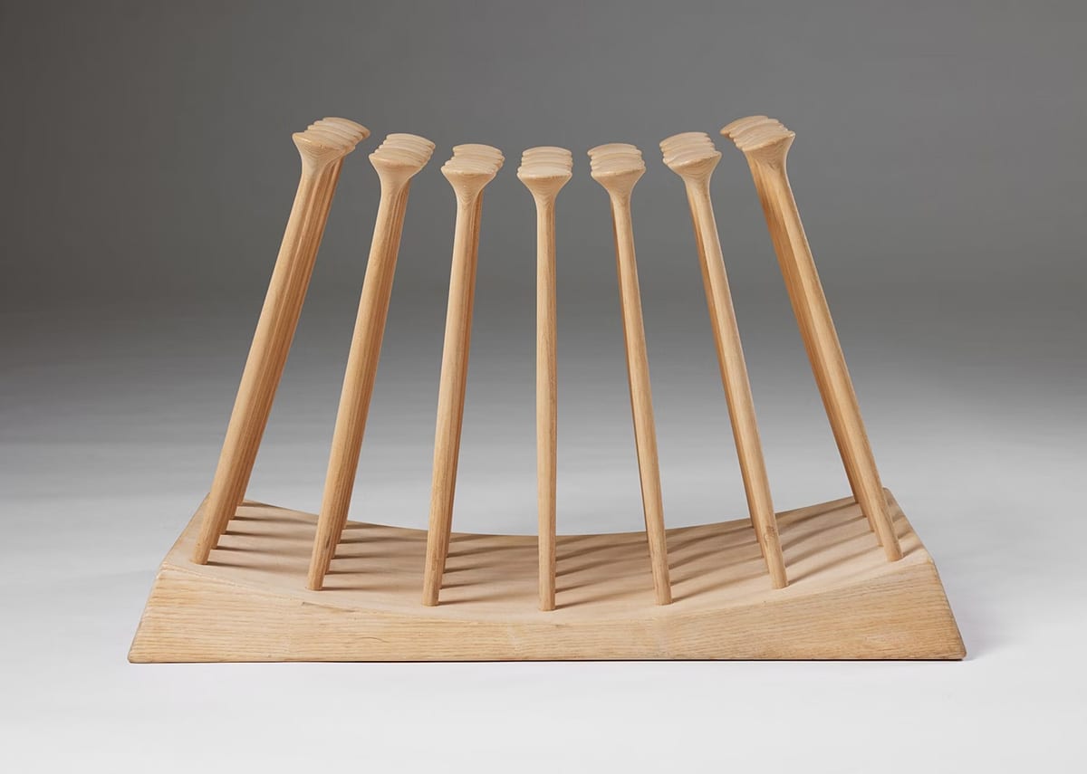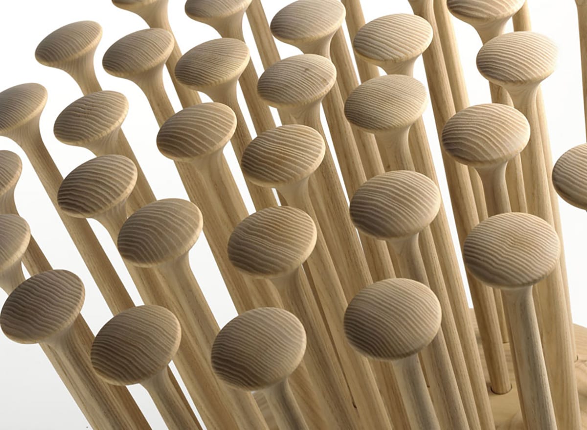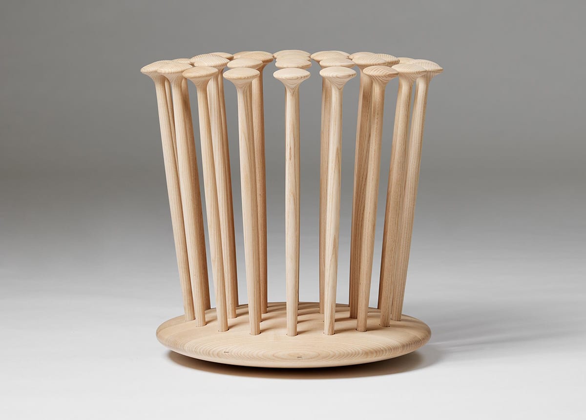37 staves driven into a circuler foot, each equipped with a turned knob, create a convex seat at a height of 43 cm, a stool that slightly rocks.