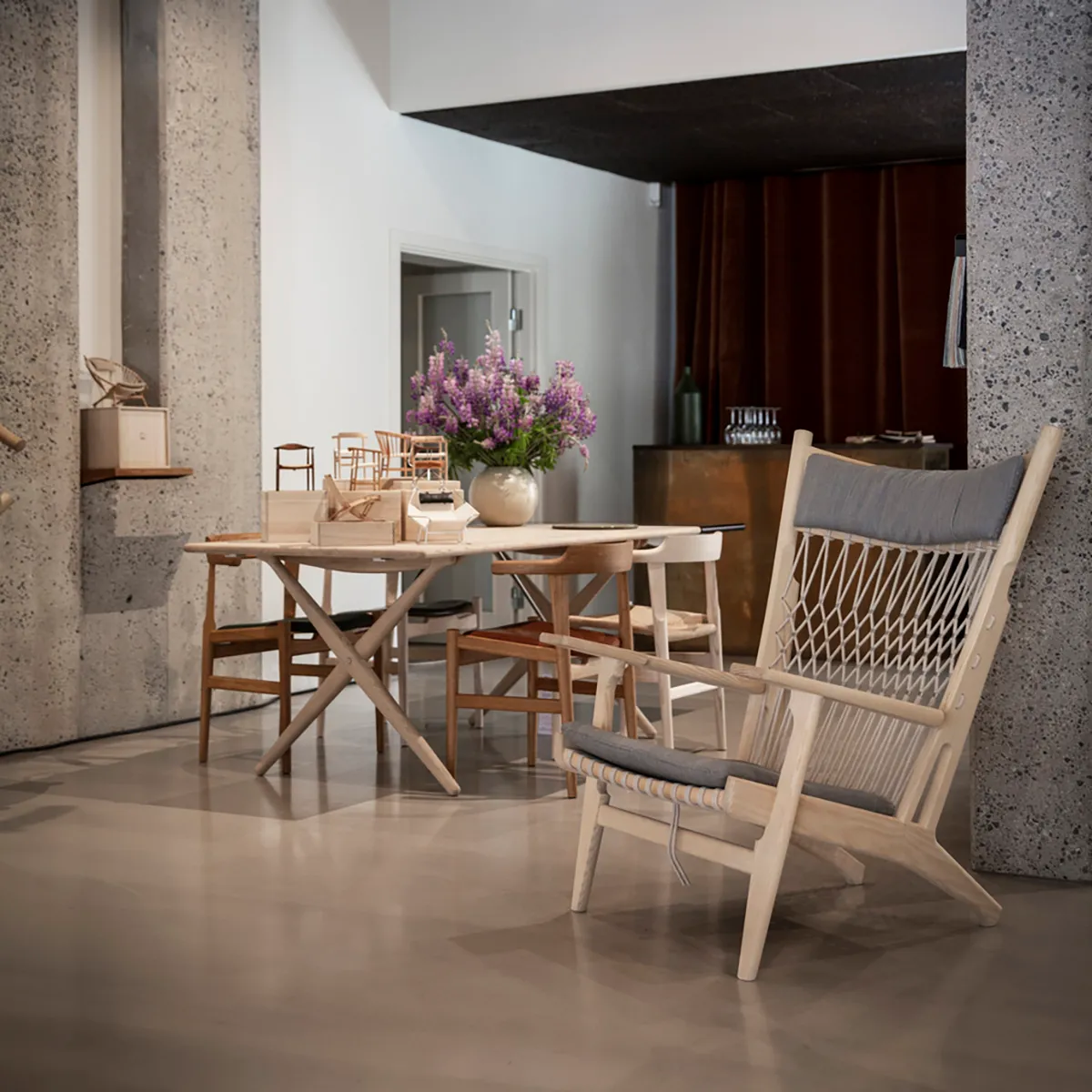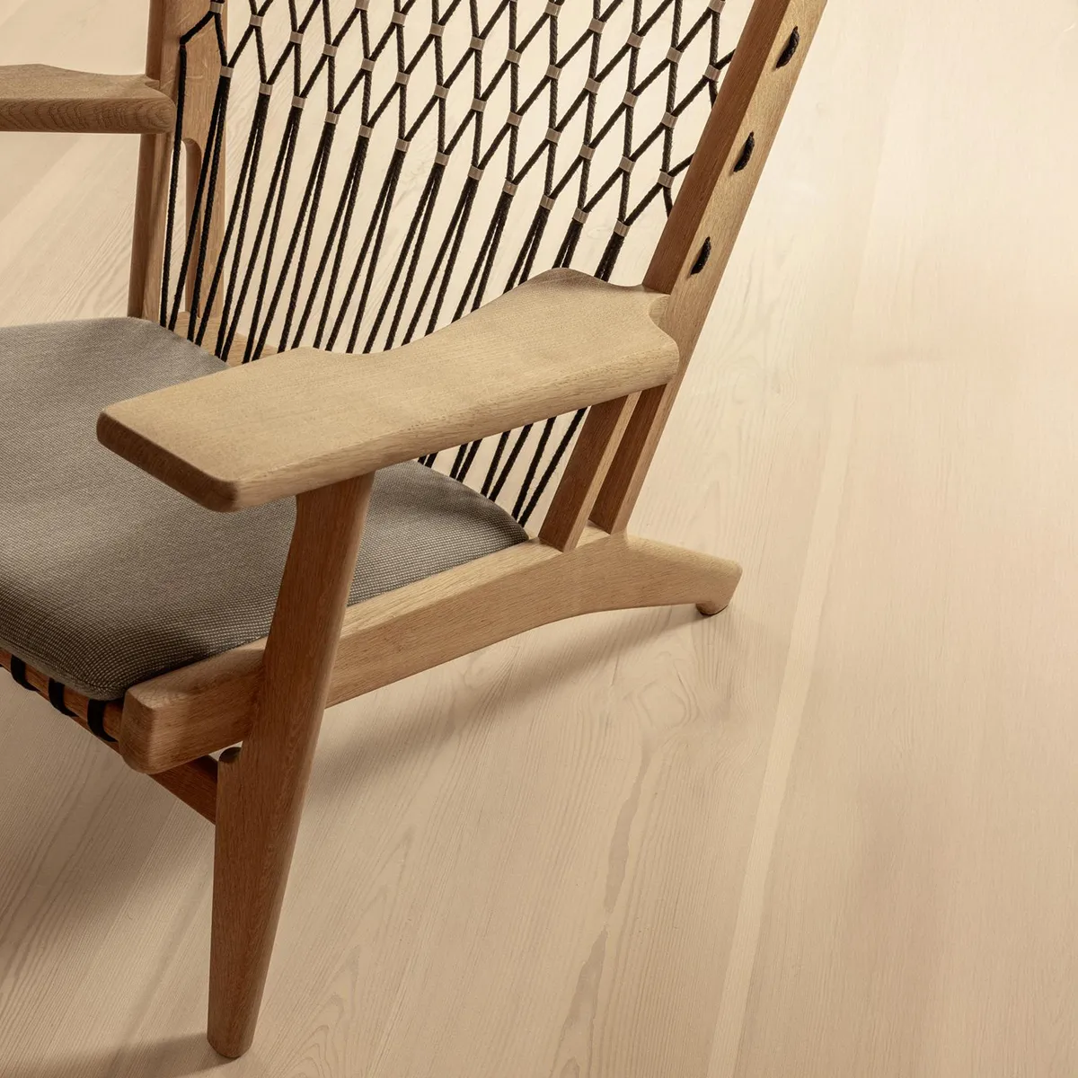 Web chair pp129 is designed by Hans J. Wegner in 1968. With the playful and abundant arm rests you will immediately sense Wegner’s joy of shaping solid wood. And still the Web Chair states the distinct idea of a transparent and yet sturdy constructed and comfortable easy chair.