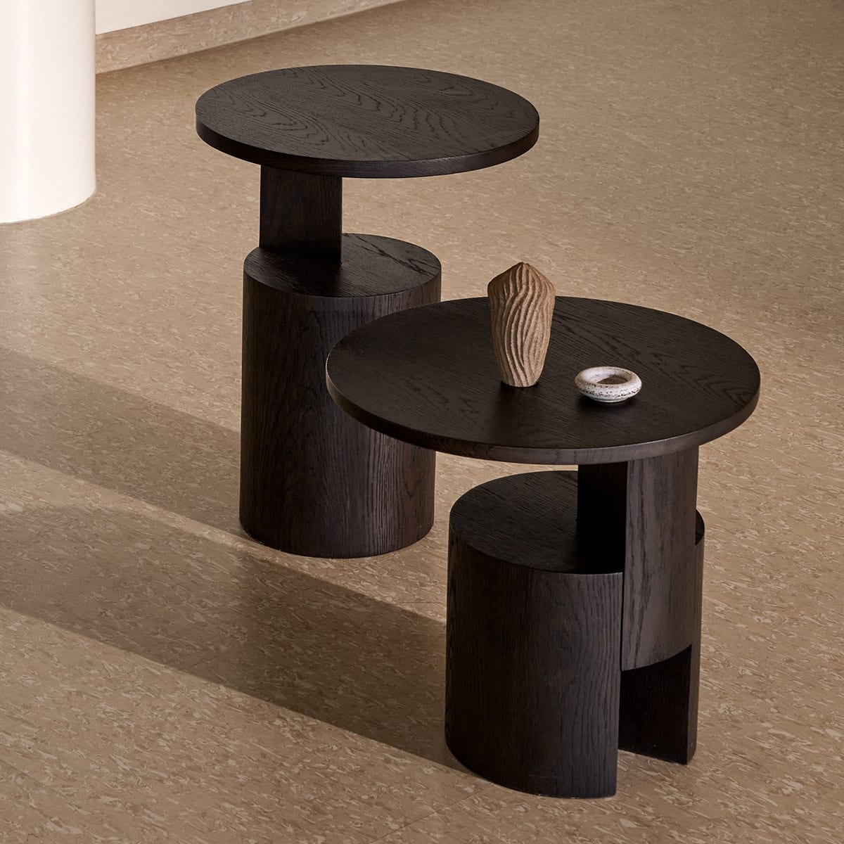 Crafted in black or dark brown stained oak veneer, the table’s silhouette evokes the effortless elevation of a cake wedge, offering a dynamic, sculptural base that provides both stability and a captivating focal point in any space.