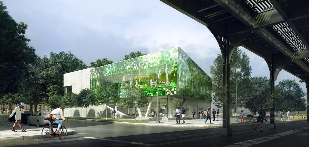 Developed as a critical node within the neighborhood, the new Westchester Square Library will deliver an important economic and educational resource to a vibrant and diverse section of the borough. Located beside the historic Huntington Free Library, a non-circulating library that predates NYPL by four years, the new Westchester Square branch will extend the site’s legacy as a place where knowledge is acquired and shared for generations to come. Designed as a prismatic reading room lifted on a board-formed concrete base, the Library’s fritted glass facades are inspired by The Bronx’s status as the “greenest Borough of New York City” and depict abstract views of the borough’s tree canopies.