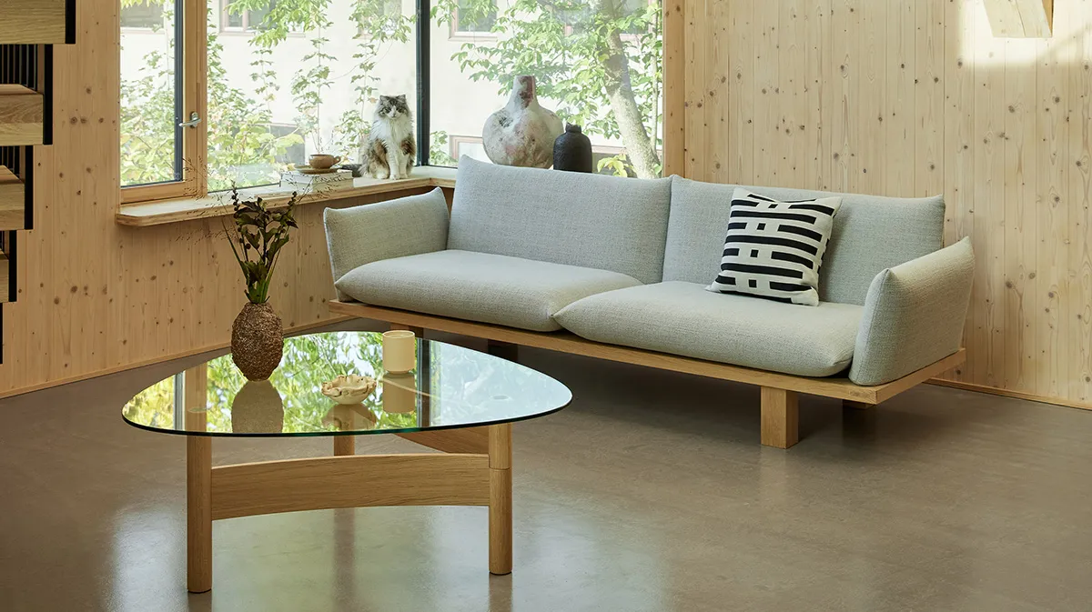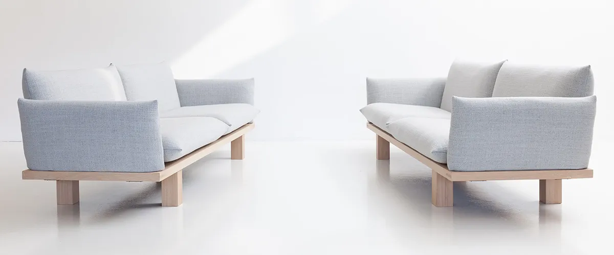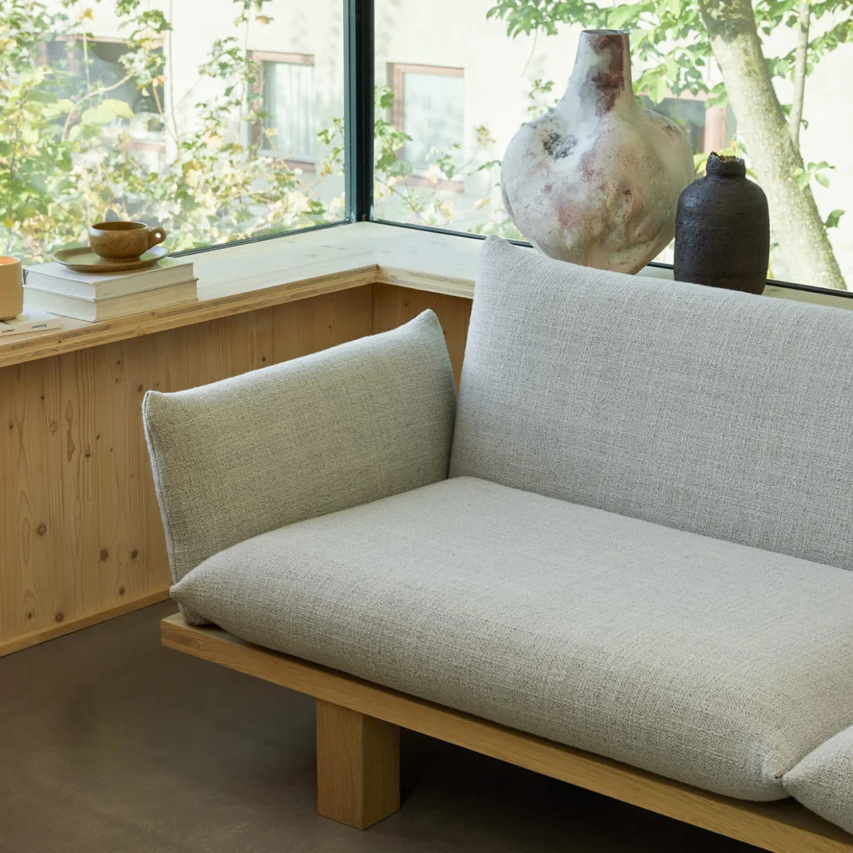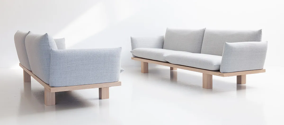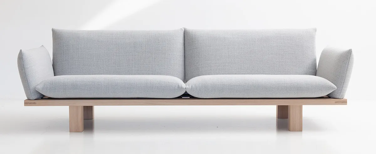 The LESS sofa consists of two main elements: casual cushions and a distinct, solid wooden base.