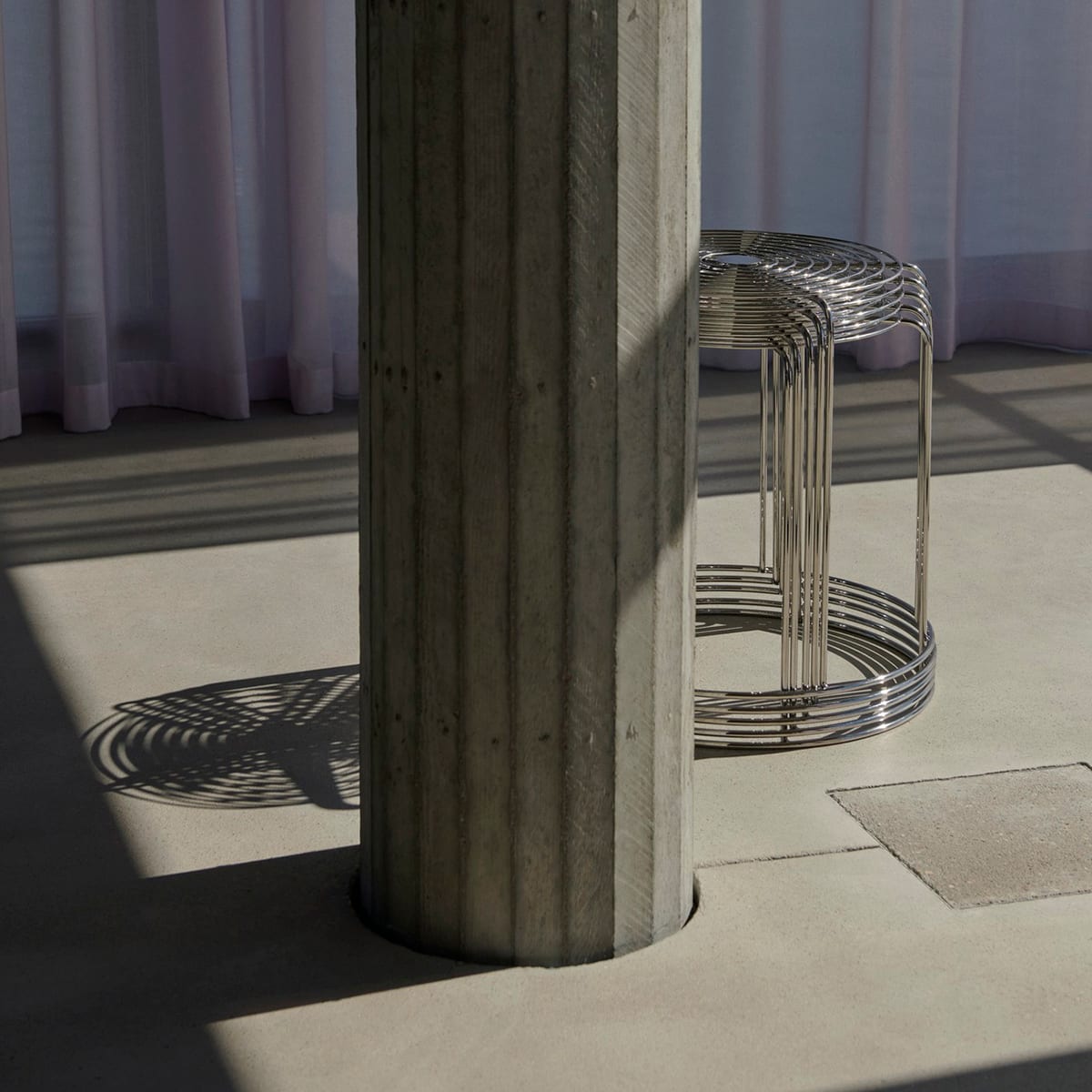 Part of the aesthetic appeal of the Wire Stool is its airy, almost transparent appearance. Seen from above, the seat is crafted in concentric circles with a mesmerizing graphic effect. The physical lightness of the wires belies the stable construction and facilitates easy stackability of up to 12 stools. Once stacked, the optical effect is amplified in the repeated linear motif of the legs, affixed to the circular wire base.