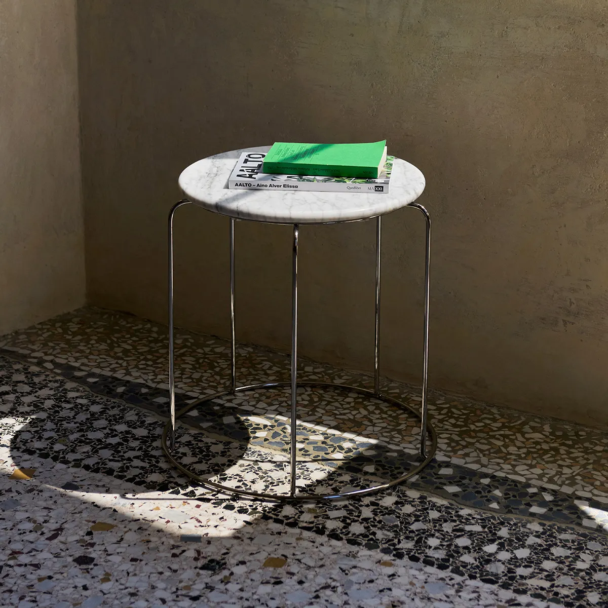 Tactile and intuitive: Verner Panton’s 80s Wire Stool transforms into a side table with marble addition