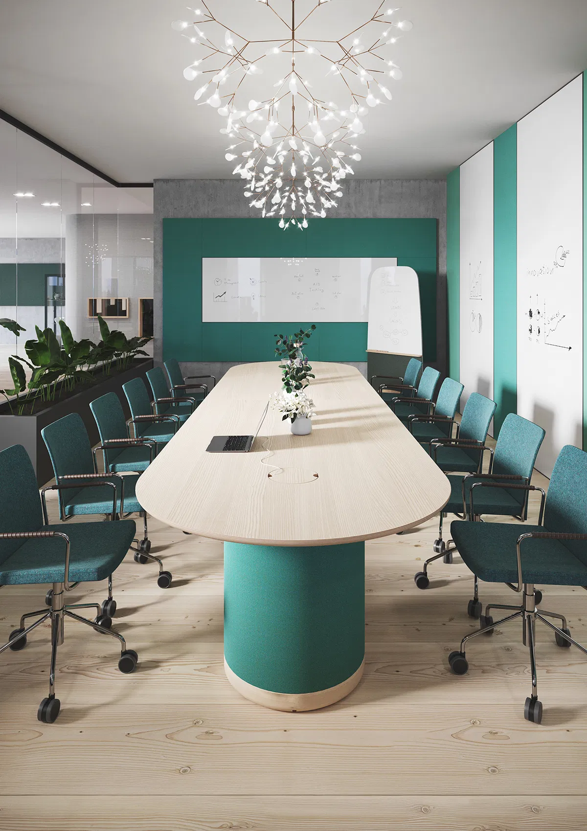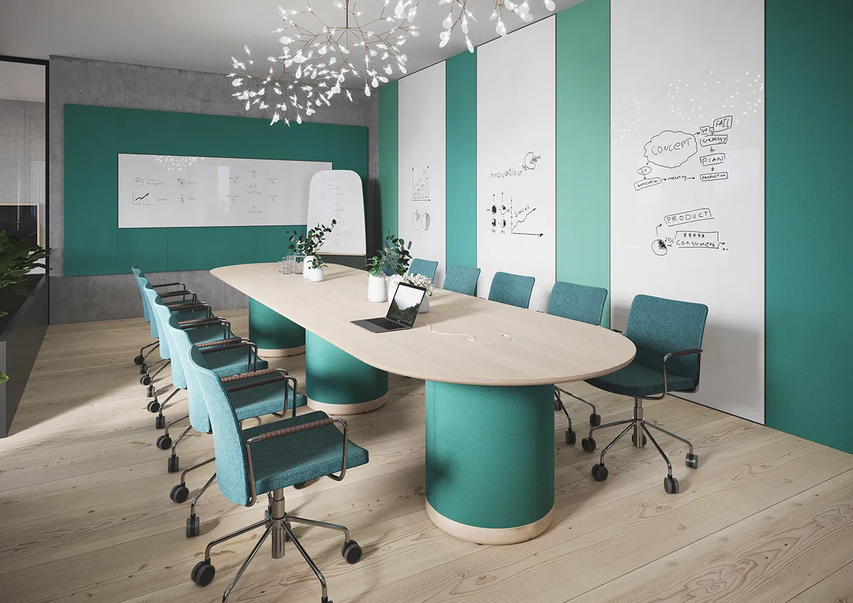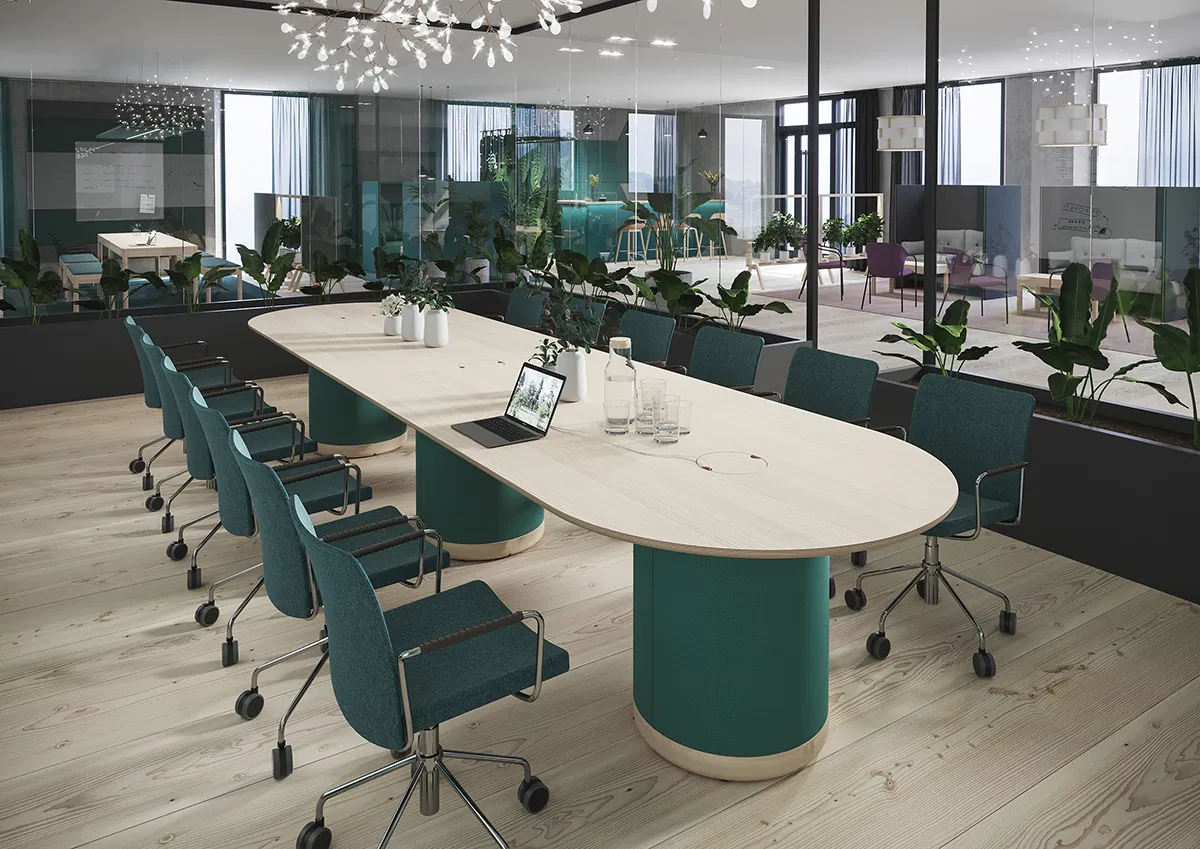 Woofer is a flexible and modular meeting table, with sound absorbent features. The modular system makes it possible to extend it from a small meeting table at 1,2 meters to a really large conference table at 6 meters, or even longer if you need it. The wiring and electrical chargers are neatly hidden in the pillars. You can choose between a wide variety of surface materials and colours, and also a large variety of fabrics for the pillars. Woofer is a beautiful furniture for the office, lobby or any other area where you need functional meeting tables with excellent acoustic features. The tabletop in plywood birch is available in linoleum, ash veneer or laminate.